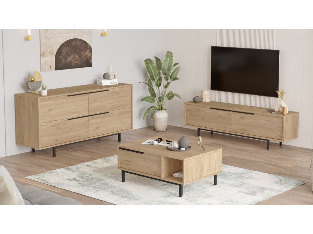 spojuje funkčnost a moderní design. Televizní stolek nabízí prostor pro elektroniku a multimediální zařízení, konferenční stolek je ideálním doplňkem pro odkládání občerstvení nebo dekorací a prostorná komoda poskytuje dostatek úložného prostoru pro organizaci vašich věcí. Díky preciznímu zpracování a elegantnímu vzhledu se tato sestava stane středobodem vašeho obývacího pokoje.
