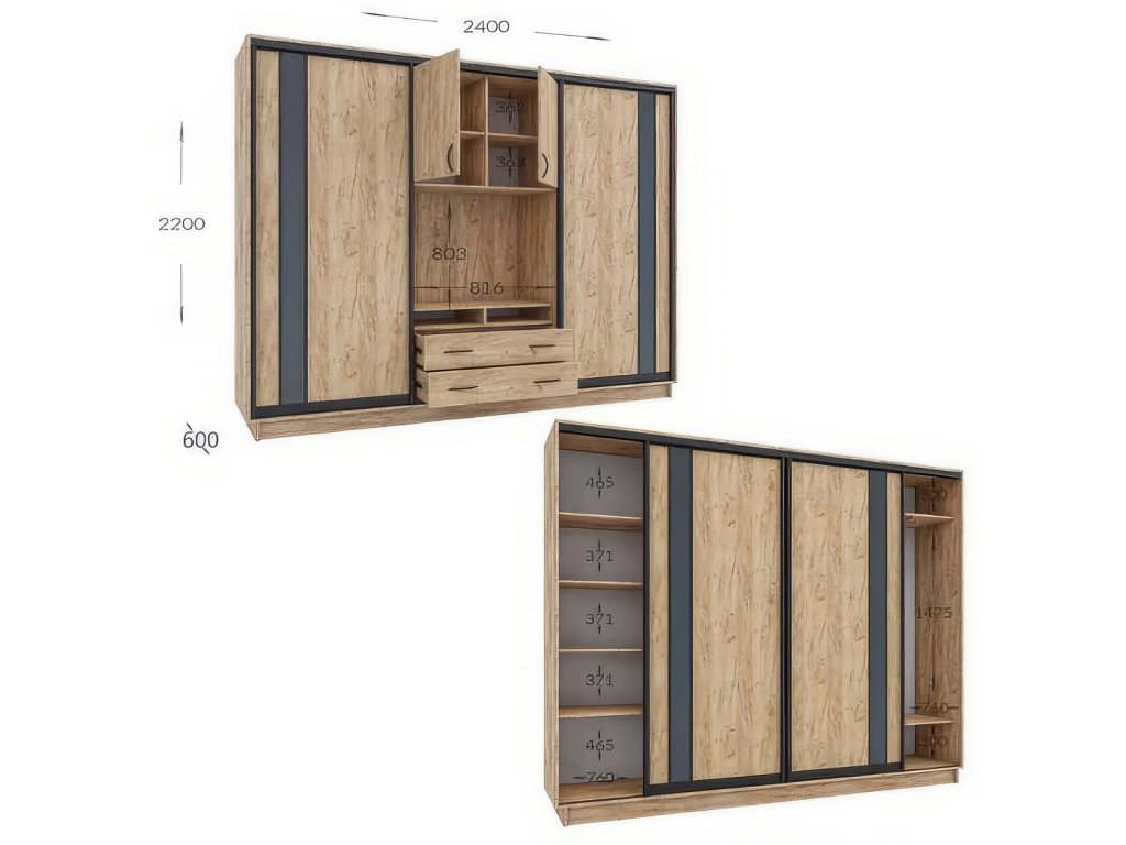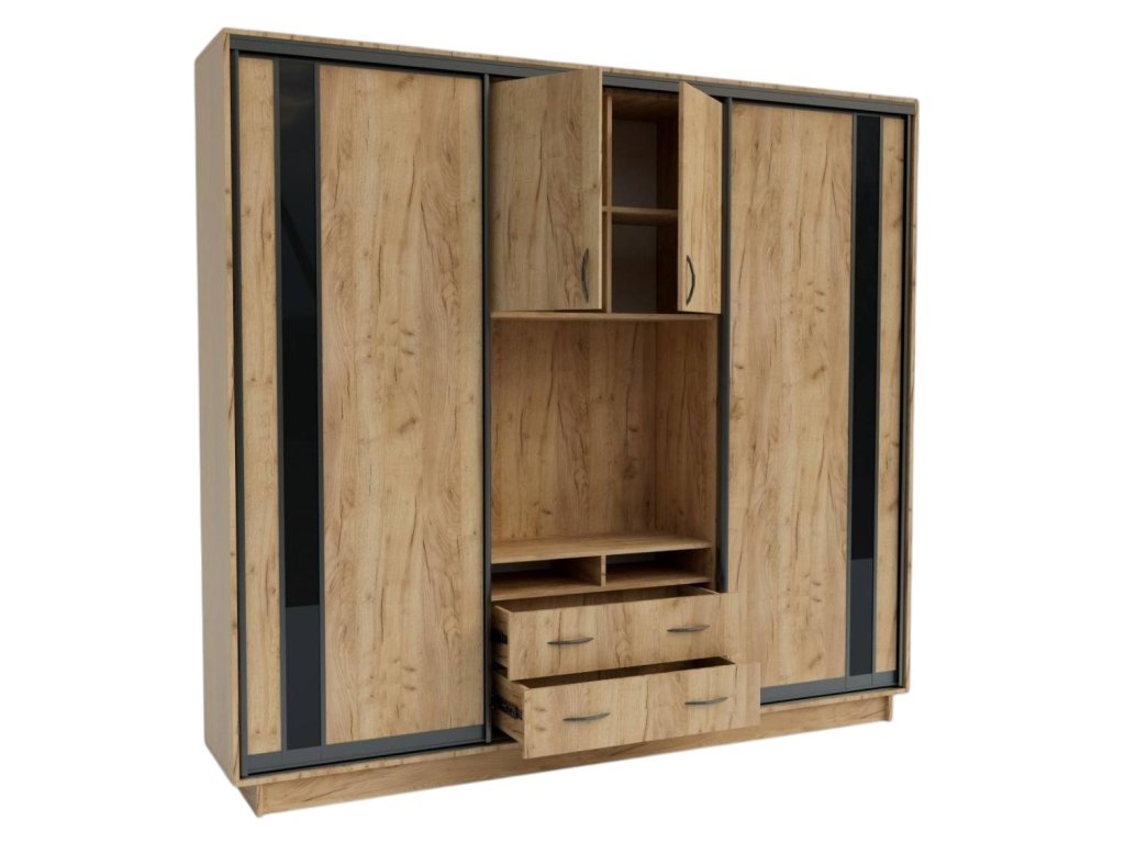 Obývací stěna/šatní skříň s posuvnými dveřmi v moderním a vyjimečném provedení. Je vhodná jak do ložnice, tak do obývacího pokoje pro efektivní využití prostoru. Nezvyklá výška 220 cm a šířka 240 cm Vám nabídne opravdu velký úložný prostor. Skříň navíc v prostřední části nabízí v celku obyvací stěnu - prostor pro TV, pak má praktickou vrchní dvoudveřovou skříňku a ve spodní části dvě prostorné zásuvky. Rozměry na obrázku. Barevné provedení je dub zlatý craft, dvířka jsou dekorovány pásy v černé matné barvy. Dodáváme v demontovaném stavu.
