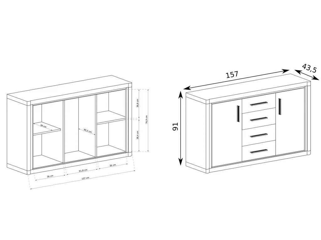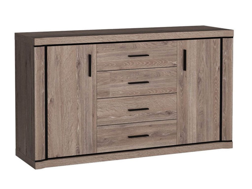 Komoda ze sektorové řady je kombinovaná, má ve středu čtyři zásuvky a po stranách jedny dvířka, za kterými je jedna polička. Má zajímavé provedení v podobě netradičně vyřezávaných vrchních a spodních desek. Systém je exkluzivní kolekce navržena v moderním duchu. Celá řada se vyznačuje masivním vzhledem a jednoduchými tvary. Nábytek je vyroben z kvalitního LTD s lištami z MDF, součástí nábytku jsou desky 48 mm, vše opatřeno ABS páskou. Barevné provedení - dub lanýž. Sektor má široký výběr komponentů, díky kterým lze vybavit nejen obývací pokoj, ale i jídelnu, kancelář nebo ložnici. Dodáváme v demontovaném stavu.Doplňkové parametry