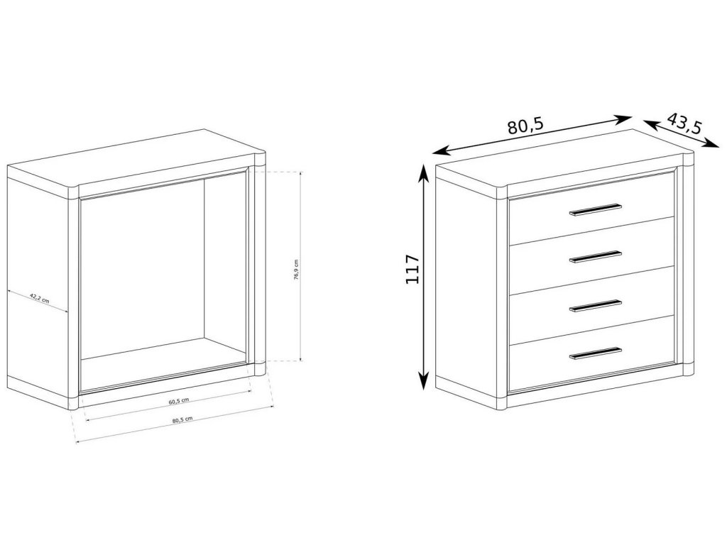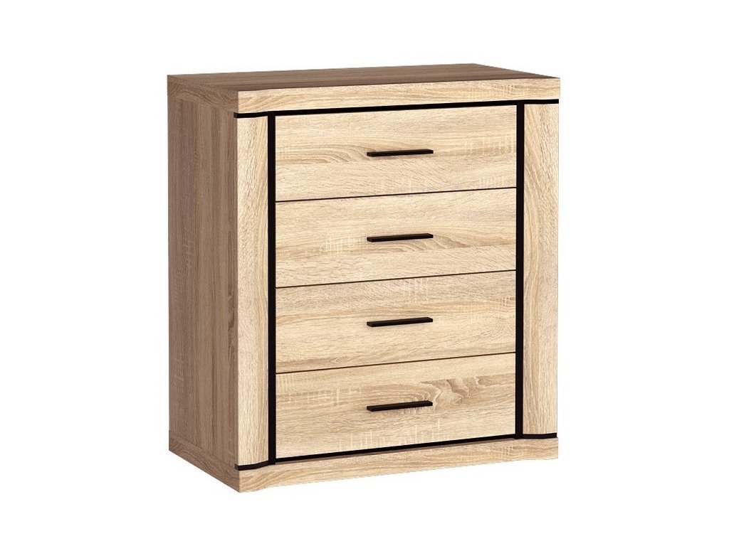 Komoda ze sektorové řady má čtyři zásuvky. Má zajímavé provedení v podobě netradičně vyřezávaných vrchních a spodních desek. Systém je exkluzivní kolekce navržena v moderním duchu. Celá řada se vyznačuje masivním vzhledem a jednoduchými tvary. Nábytek je vyroben z kvalitního LTD s lištami z MDF, součástí nábytku jsou desky 48 mm, vše opatřeno ABS páskou. Barevné provedení - dub sonoma. Má široký výběr komponentů, díky kterým lze vybavit nejen obývací pokoj, ale i jídelnu, kancelář nebo ložnici. Dodáváme v demontovaném stavu.Doplňkové parametry