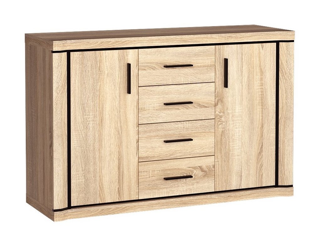 Komoda ze sektorové řady je kombinovaná, má ve středu čtyři zásuvky a po stranách jedny dvířka za kterými je jedna polička. Má zajímavé provedení v podobě netradičně vyřezávaných vrchních a spodních desek. Systém je exkluzivní kolekce navržena v moderním duchu. Celá řada se vyznačuje masivním vzhledem a jednoduchými tvary. Nábytek je vyroben z kvalitního LTD s lištami z MDF, součástí nábytku jsou desky 48 mm, vše opatřeno ABS páskou. Barevné provedení - dub sonoma. Má široký výběr komponentů, díky kterým lze vybavit nejen obývací pokoj, ale i jídelnu, kancelář nebo ložnici. Dodáváme v demontovaném stavu.Doplňkové parametry