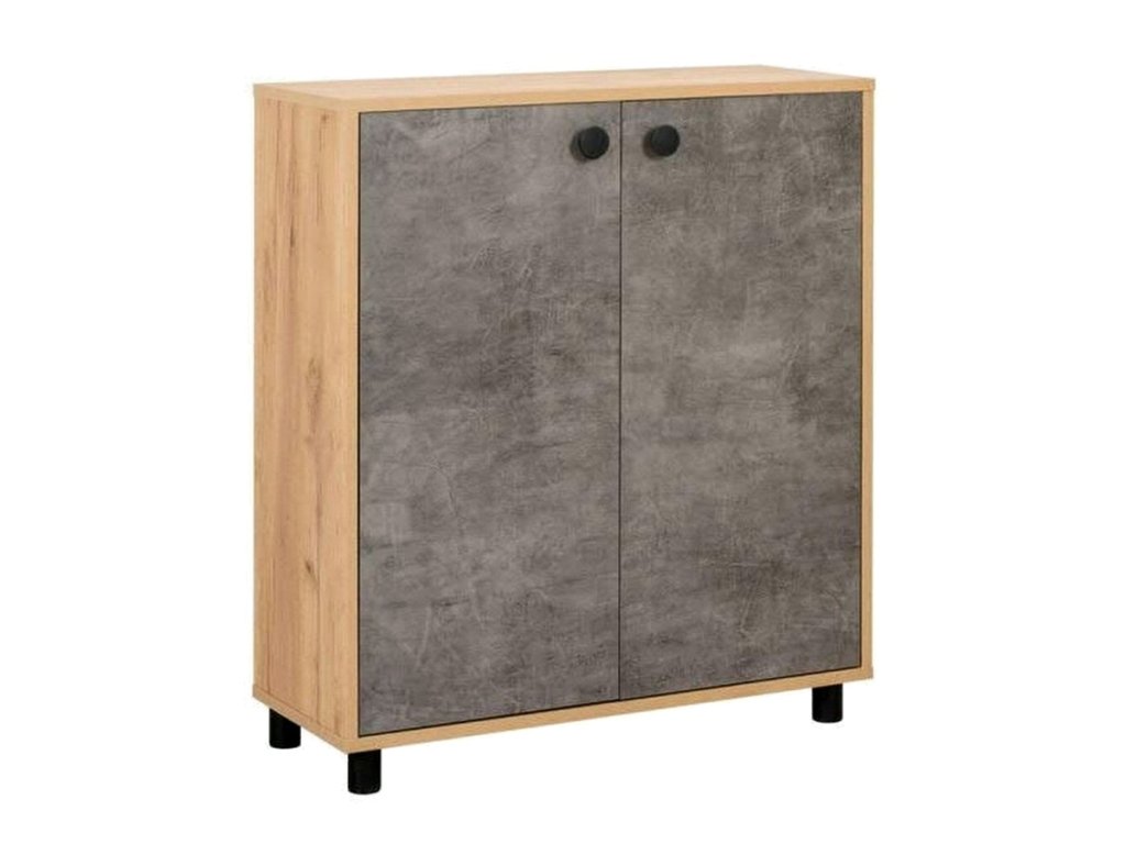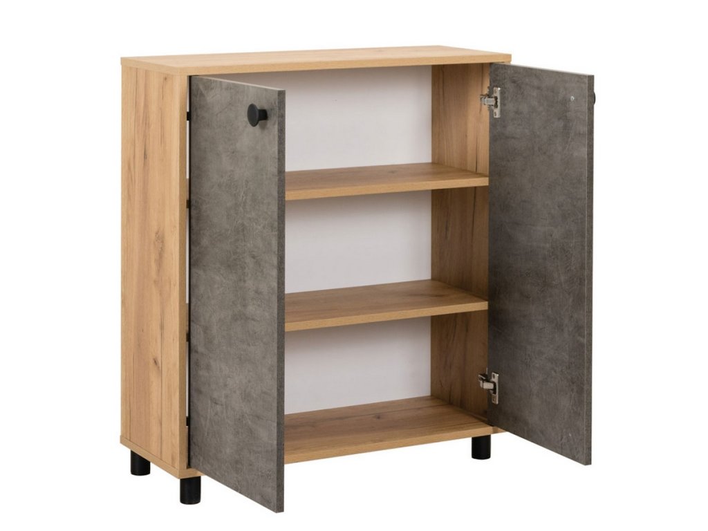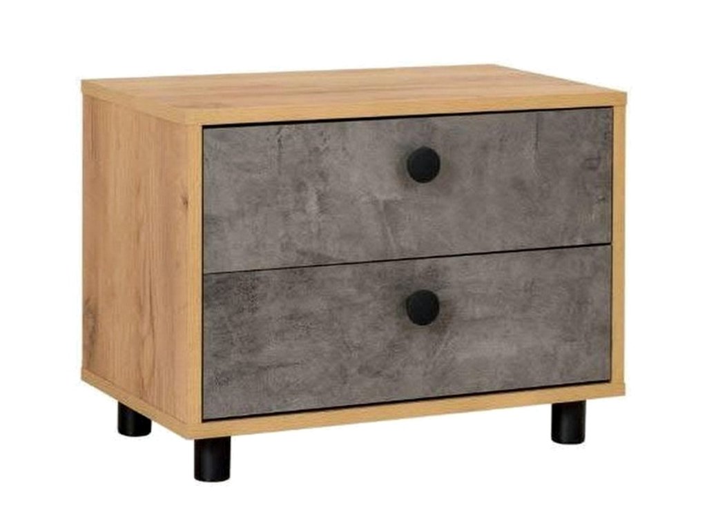 Botník se dvěma zásuvkami je vyroben z desky LTD, korpus je v barvě dub kraft zlatý, čela zásuvek jsou v barvě tmavý kámen. Nožky jsou v černé barvě. Úchyty jsou z kovu v černé barvě. Dodáváme v demontovaném stavu.