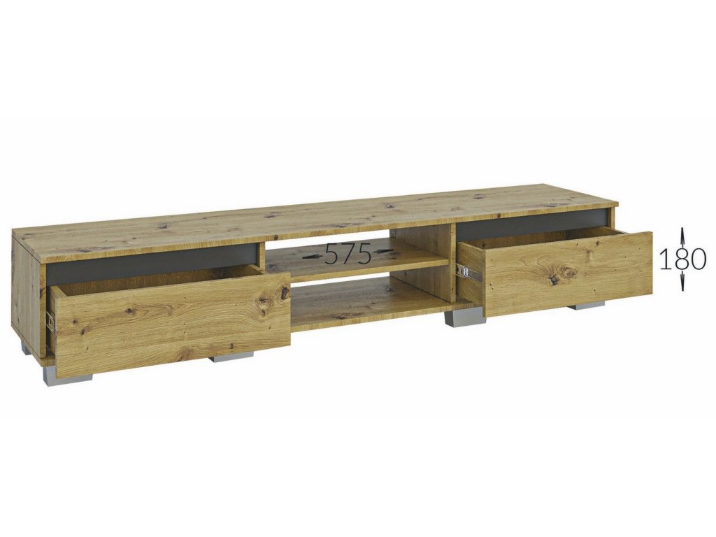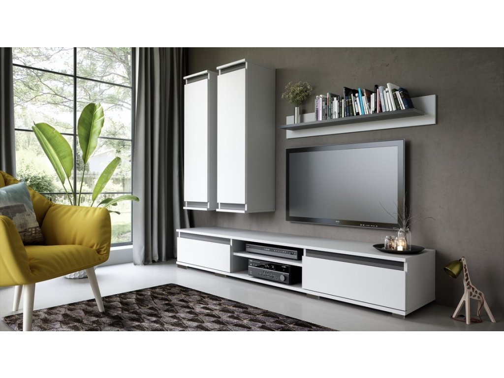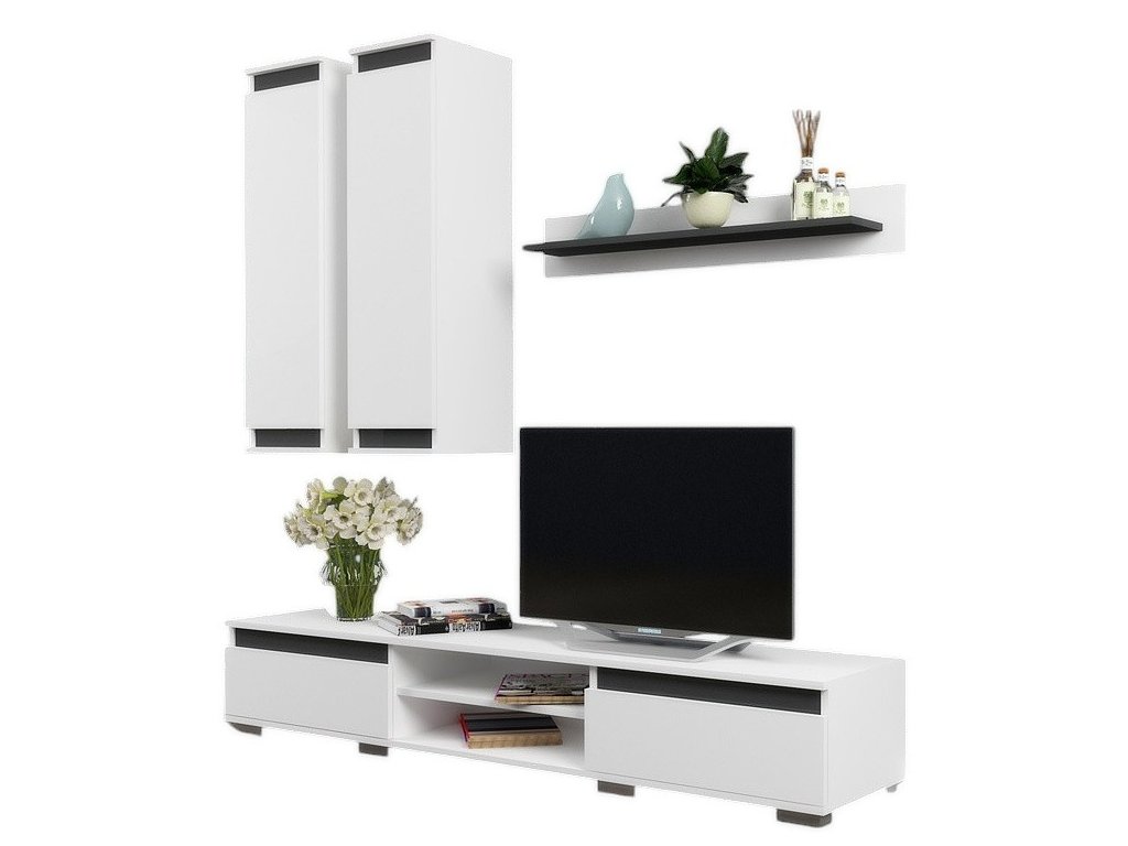 Levná obývací stěna v moderním barevném provedení se stane výrazným prvkem každé místnosti. Kombinace bílé barvy s dekoračními lištami z MDF šedé lesklé barvy. Nábytek je vyroben z kvalitního lamina hraněného melaninem. Sestava se skládá z ( šířka/hloubka/výška ) - televizní stolek se 2 zásuvkami ( 175,2 x 37 x 25,8 cm ), 2x závěsná skříňka 1-dveřová ( 28 x 30,6 x 100,2 cm ) a police ( 98,2 x 16 x 15 cm ). Tato stěna se prodává jako sestava, jednotlivé díly nelze koupit zvlášť. Dodáváme v demontovaném stavu.Zusätzliche Parameter