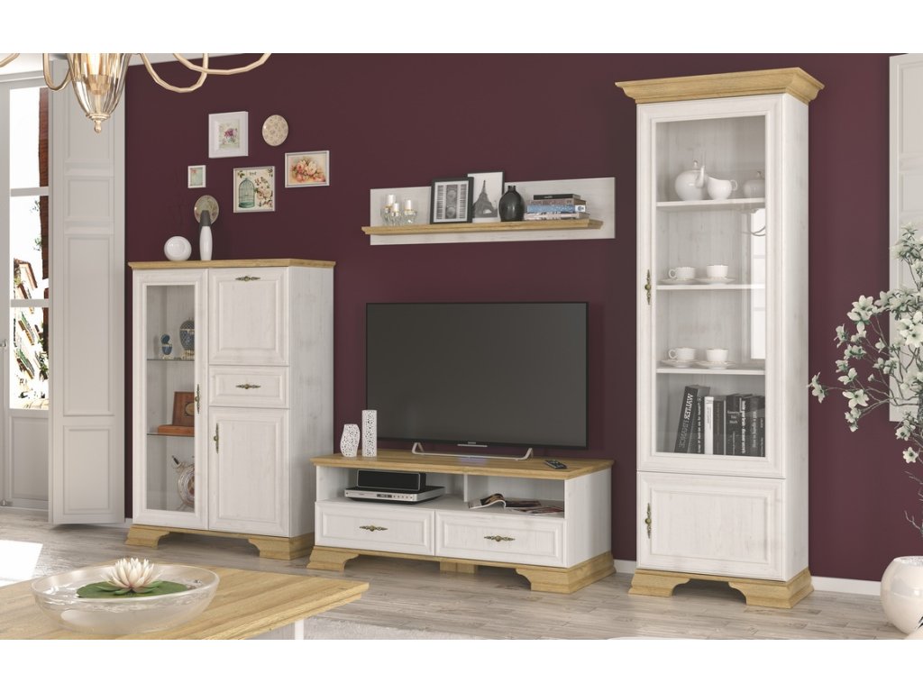 Systém je exkluzivní kolekce navržena v moderním duchu. Celá řada se vyznačuje elegancí a jednoduchými tvary, které zaručují plné využití prostoru. Nábytek je vyroben z kvalitní LTD v kombinaci s MDF v barevné kombinaci borovice andersen/zlatý dub. Sestava se skládá ( šxhxv ) - vitrína ( 70,3 x 43 x 197,6 cm ), komoda ( 93,4 x 39 x 133 cm ), tv stolek ( 121 x 51 x 47 cm ) a police ( 119 x 17,6 x 25,6 cm ). Dodáváme v demontovaném stavu.Zusätzliche Parameter
