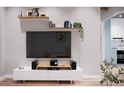 Obývací sestava VISALIA (2x skříňka závěs, 2x TV stolek, police, police s dvířky) dub artisan/bílá