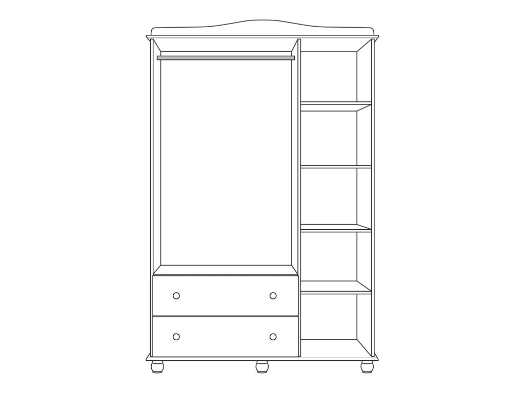 v levé části dveře se zrcadlem, kovová šatní tyč, 2 zásuvky s kovovými pojezdy
