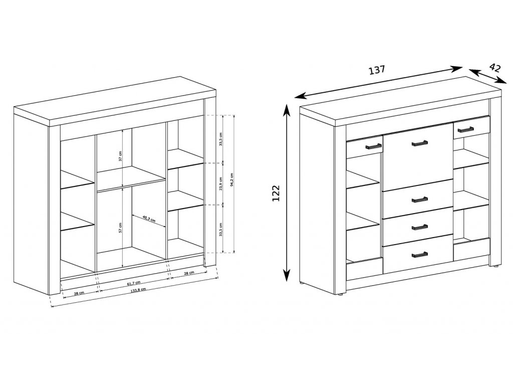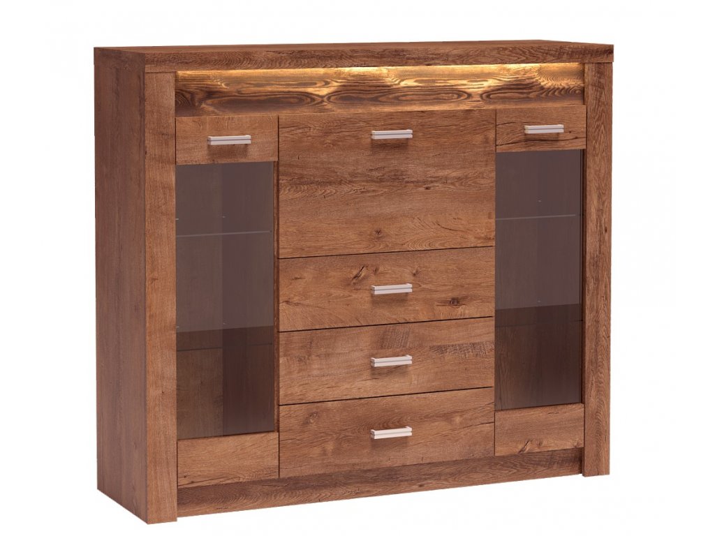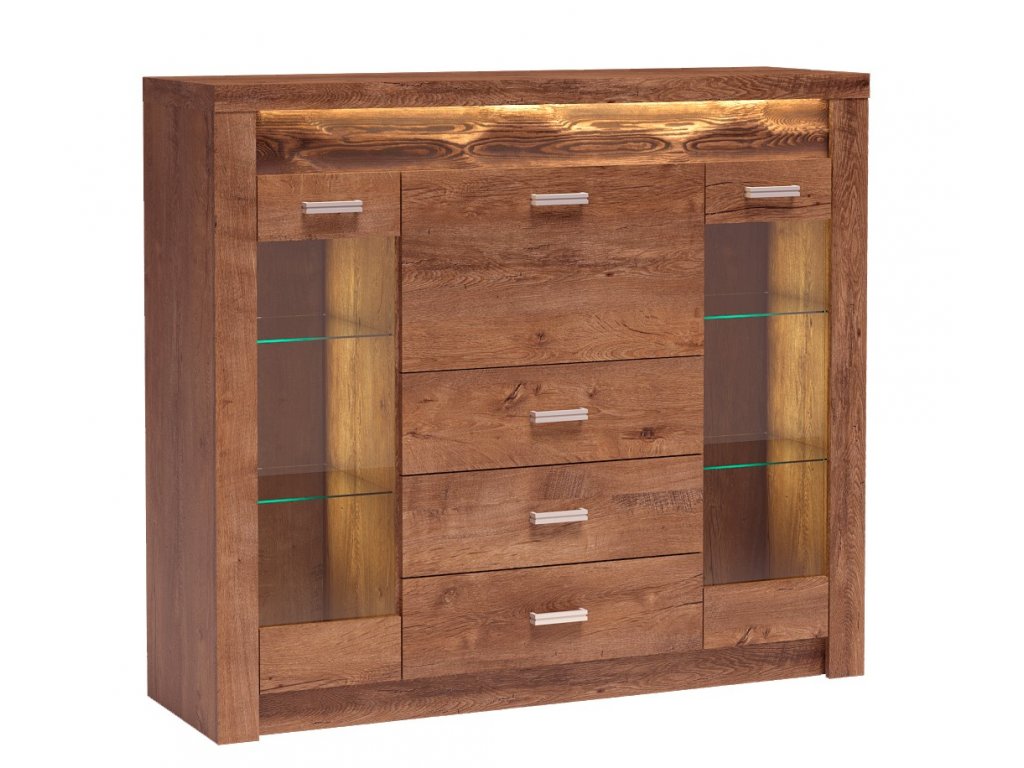 Komoda - bar ze sektorové řady INDIANAPOLIS. Komoda obsahuje 2 vitríny, 3 zásuvky a výklopná dvířka. Systém INDIANAPOLIS je exkluzivní kolekce navržena v moderním duchu. Vsazením LED osvětlení do ozdobné rýhované lišty, které najdete v naší další nabídce k dokoupení, je zvýrazněn rustikální vzhled masivního dřeva. Celá řada se vyznačuje elegancí a jednoduchými tvary, které zaručují plné využití prostoru. Nábytek je vyroben z kvalitního lamina s ABS hrany ( 0,5-0,8 mm ). Barevné provedení jasan světlý. Dodáváme v demontovaném stavu.Zusätzliche Parameter