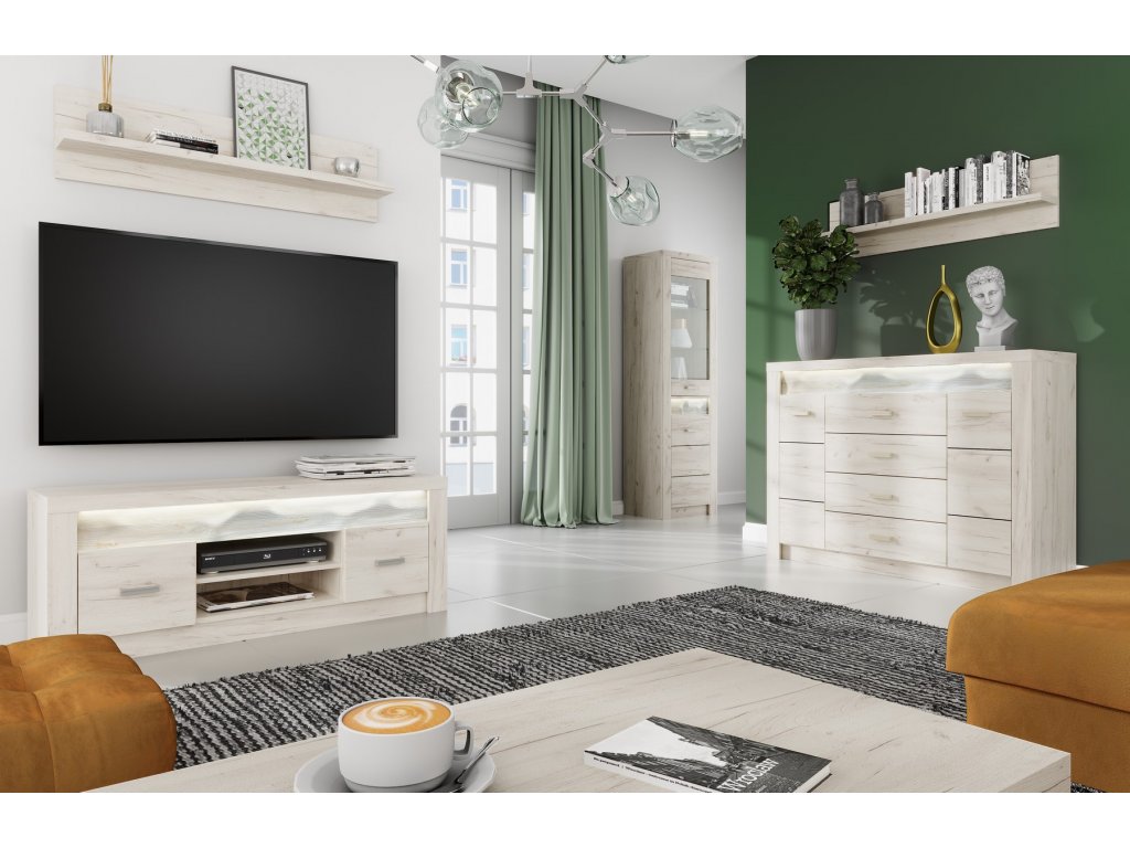 Televizní stolek ze sektorové řady INDIANAPOLIS. Stolek obsahuje 2 dvířka otvírané do stran. Systém INDIANAPOLIS je exkluzivní kolekce navržena v moderním duchu. Vsazením LED osvětlení do ozdobné rýhované lišty, které najdete v naší další nabídce k dokoupení, je zvýrazněn rustikální vzhled masivního dřeva. Celá řada se vyznačuje elegancí a jednoduchými tvary, které zaručují plné využití prostoru. Nábytek je vyroben z kvalitního lamina s ABS hrany ( 0,5-0,8 mm ). Barevné provedení jasan bílý. Dodáváme v demontovaném stavu.Zusätzliche Parameter