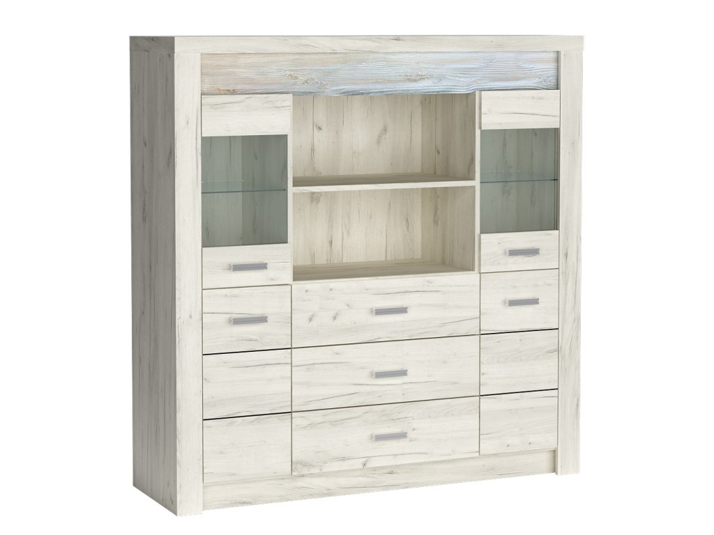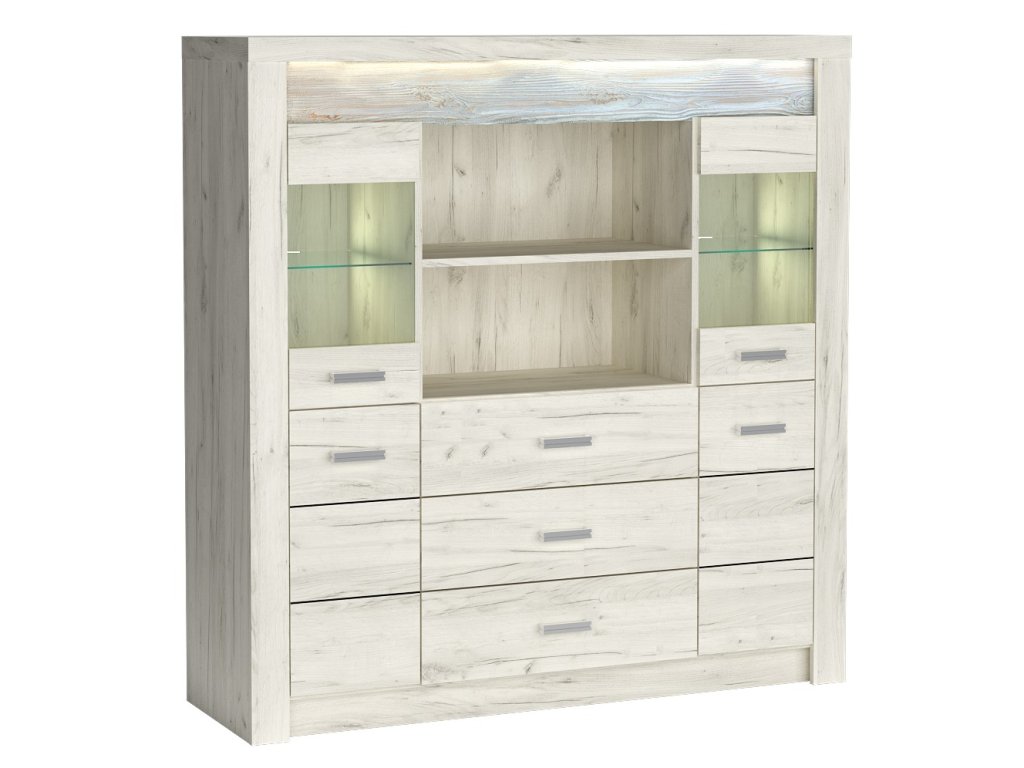 Vitrínová komoda ze sektorové řady INDIANAPOLIS. Komoda má po stranách 2 vitríny a 2 skříňky, za kterými je jedna polička, uprostřed jsou 3 zásuvky a nad nimi jedna polička. Systém INDIANAPOLIS je exkluzivní kolekce navržena v moderním duchu. Vsazením LED osvětlení do ozdobné rýhované lišty, které najdete v naší další nabídce k dokoupení, je zvýrazněn rustikální vzhled masivního dřeva. Možnost dokoupení LED bodového osvětlení i u skleněných polic. Celá řada se vyznačuje elegancí a jednoduchými tvary, které zaručují plné využití prostoru. Nábytek je vyroben z kvalitního lamina s ABS hrany ( 0,5-0,8 mm ). Barevné provedení jasan bílý. Dodáváme v demontovaném stavu.Zusätzliche Parameter