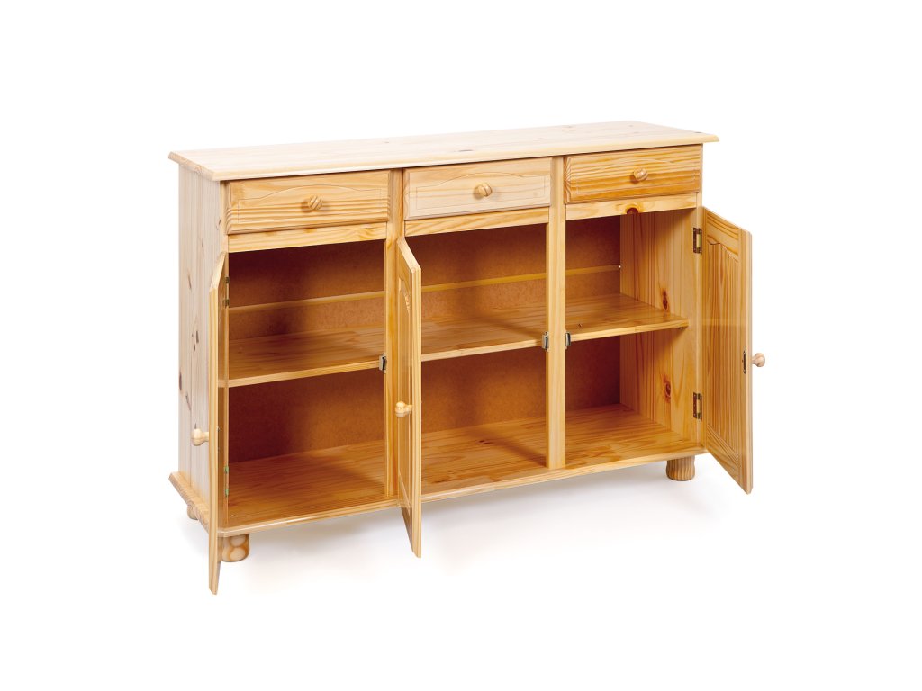 materiál masiv borovice, lakované provedení3 zásuvky s kovovými pojezdy, 3 dvířka, variabilní police