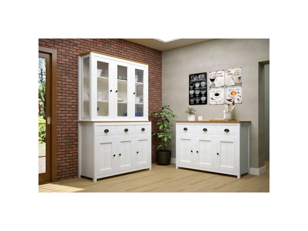 materiál masiv borovice, barevné provedení bílý / hnědý laktři zásuvky s kovovými úchytkami a pojezdy