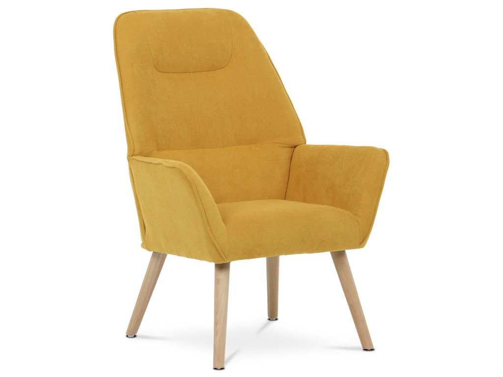 Křeslo "ušák", potah žlutá látka, nohy masiv kaučukovník