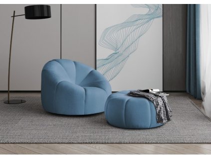 Křeslo, potah modrá voděodolná látka, kovové nohy, masiv kaučukovník