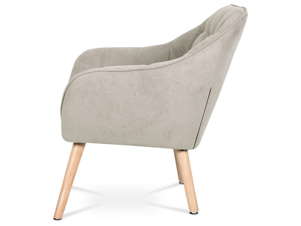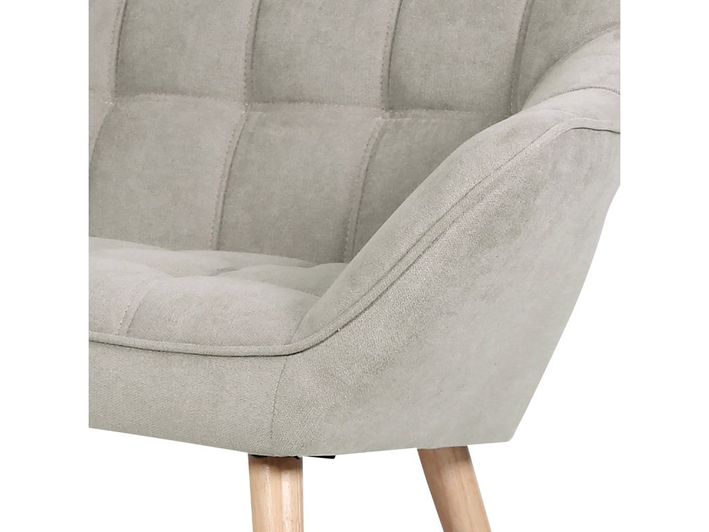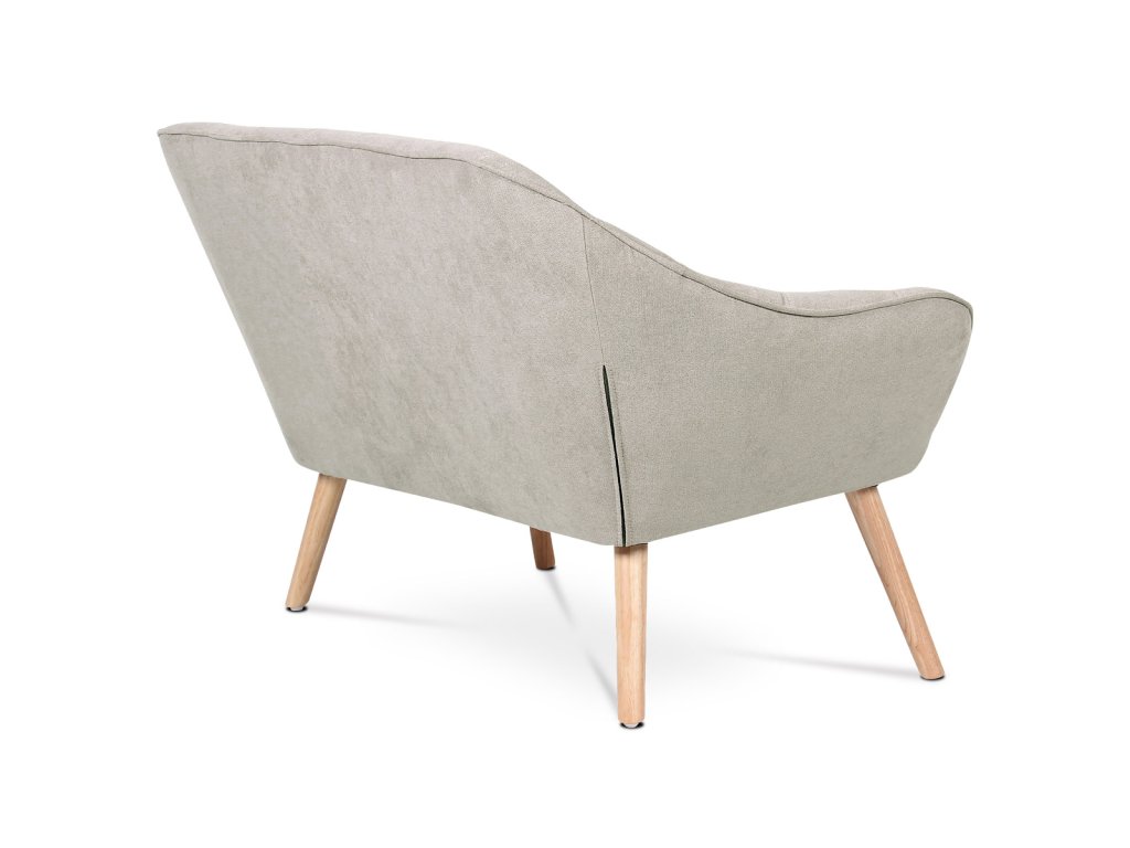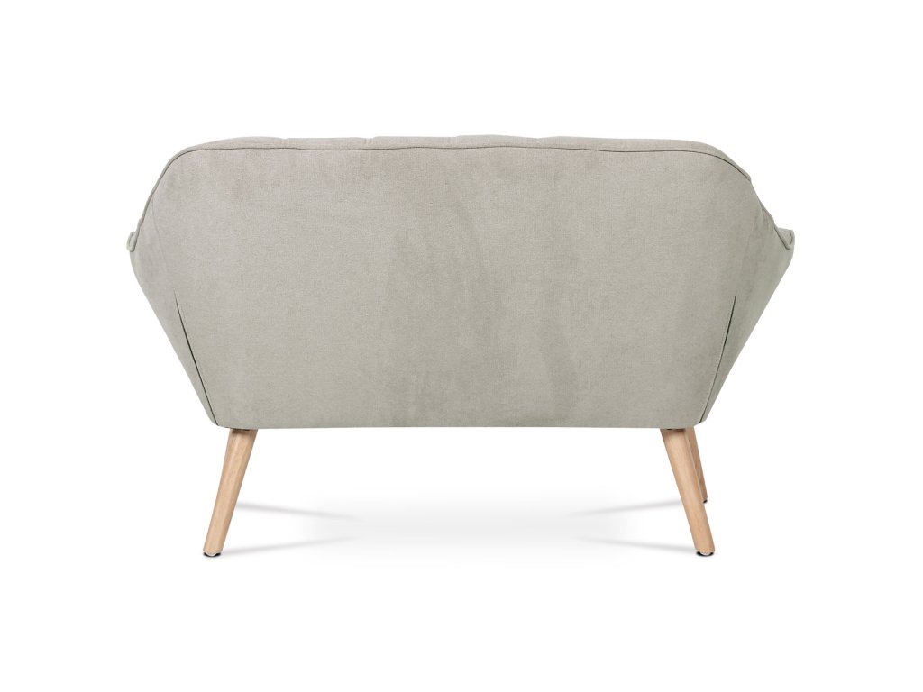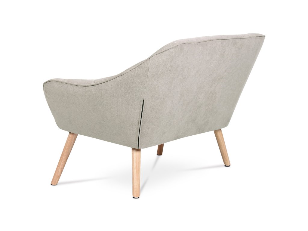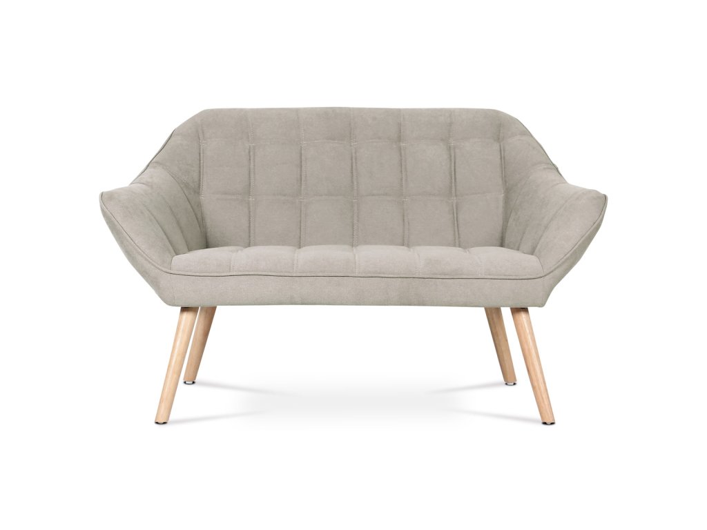 Dvousedačka, potah šedobéžová látka, dřevěné nohy, masiv kaučukovník, přírodní odstín a lak