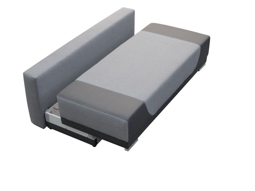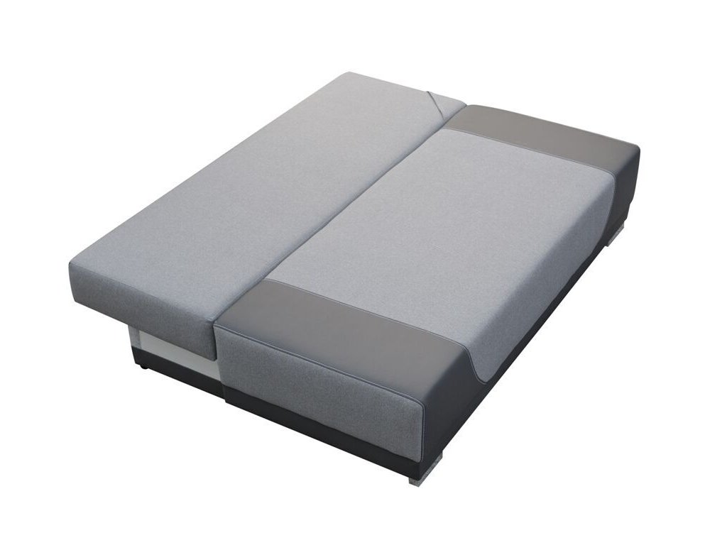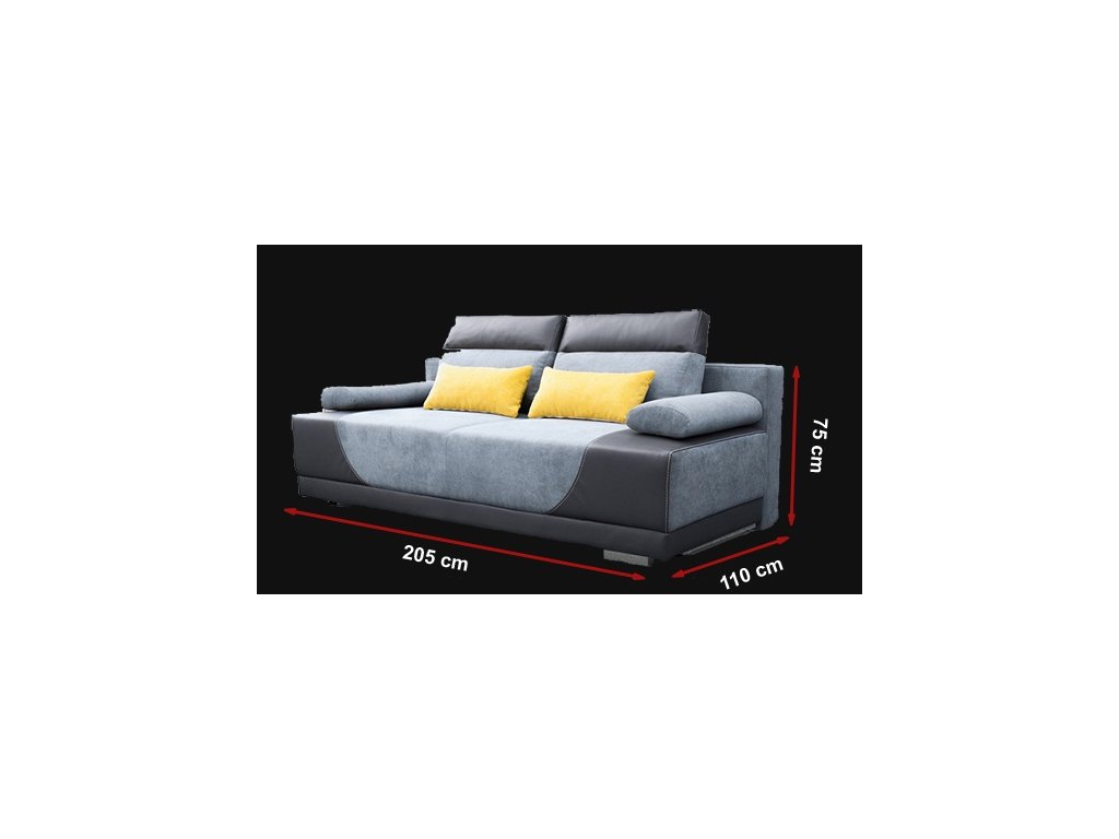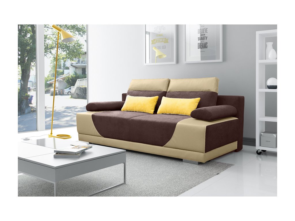 Moderní a velmi praktická rozkládací pohovka s úložným prostorem. Kombinace eko kůže a látky jí dodává zajímavý a moderní vzhled. Výplň pohovky tvoří pružiny bonell a faliste v kombinaci s kvalitní PUR pěnou. Jednoduchým rozkladem pomocí automatu vznikne lůžko vhodné k příležitostnému spaní. Pohovku dodáváme v několika barevných provedeních, které také naleznete v naší nabídce. V ceně pohovky jsou 2 velké opěrné polštáře, 2 polštáře po stranách, které plní funkci područí a dva malé žluté polštářky. Ostatní vyobrazené dekorace nejsou v ceně.