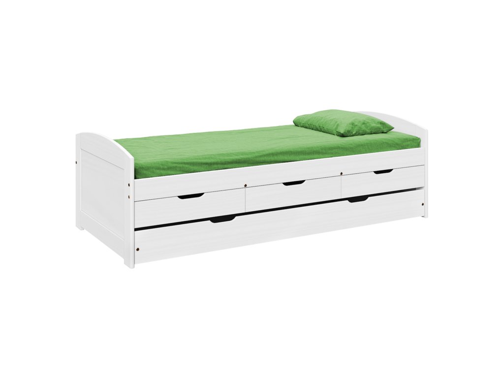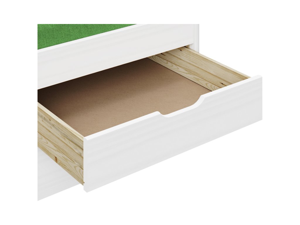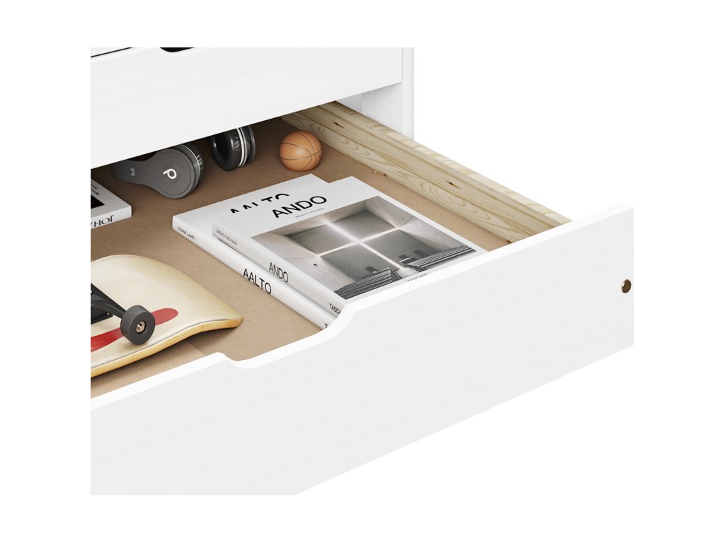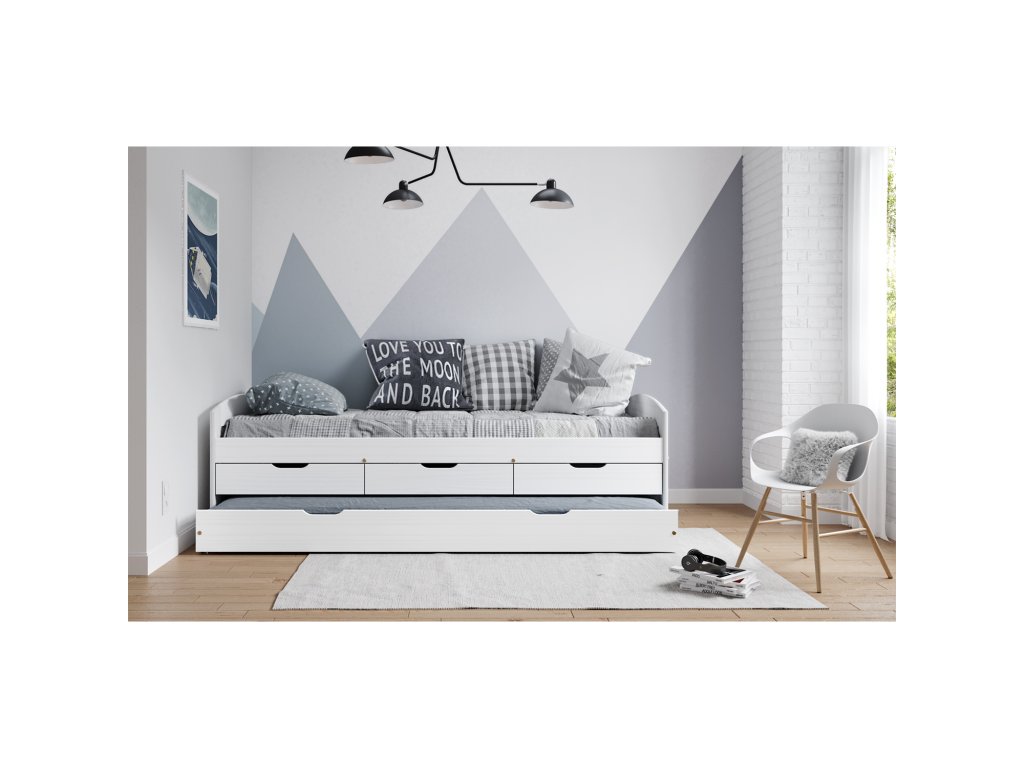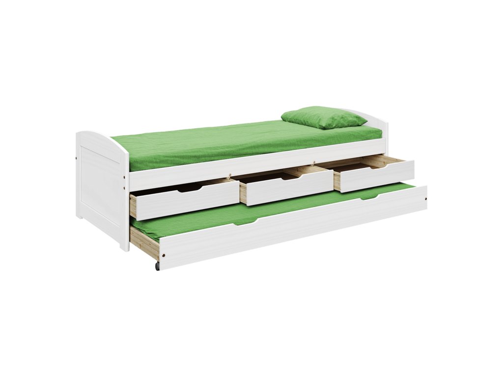 materiál masiv borovice, barevné provedení bílý lakmodel ULLI, výška sedu 52 cm, praktické úložné prostory pod postelí (3 zásuvky a výsuv) jsou v ceně