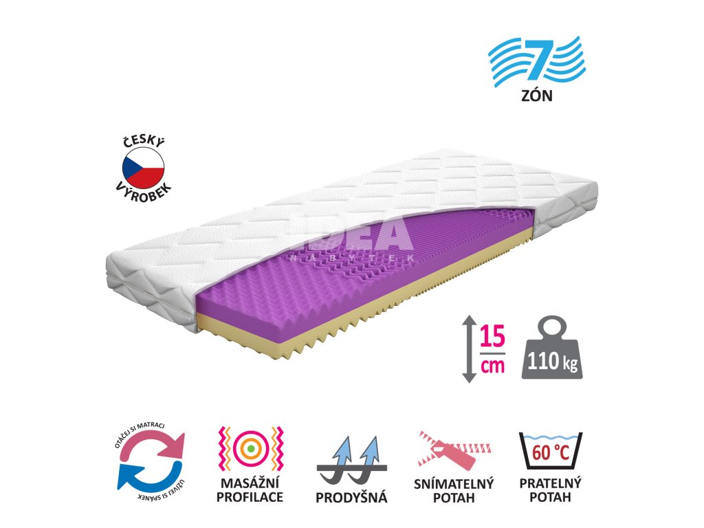 ortopedická sendvičová matrace s rozdílnou tuhostí strananatomická zónová masážní profilace – 7 zón na obou stranách pro uvolnění a relaxaci celého těla, maximální vzdušnost, ideální ortopedické vlastnosti