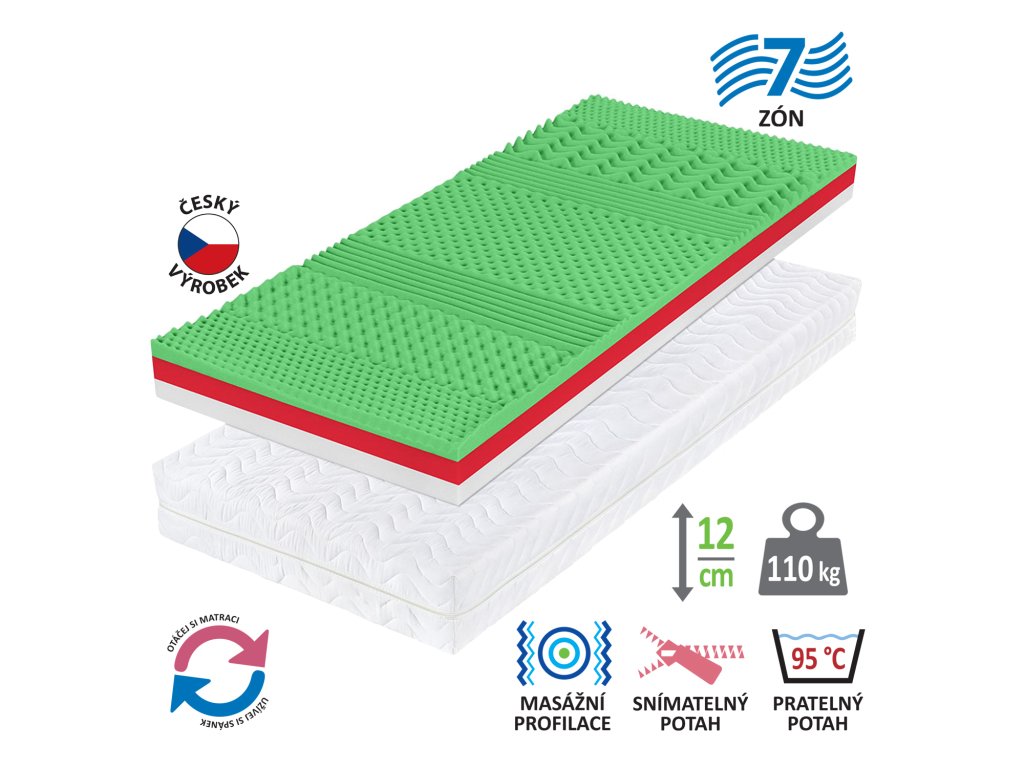 ortopedická sendvičová matrace z pěn Flexifoam s rozdílnou tuhostí strananatomická zónová masážní profilace – 7 zón pro uvolnění a relaxaci celého těla na jedné straně a rovná ložná plocha na druhé straně