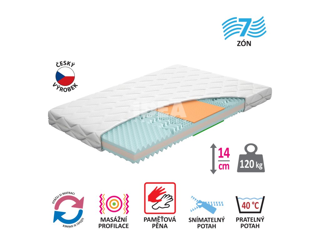 paměťová pěna různých tuhostí v pánevních zónách přináší odlehčení kloubům a celému pohybovému aparátu7zónová anatomická masážní profilace – velice jemná masáž v průběhu spánku