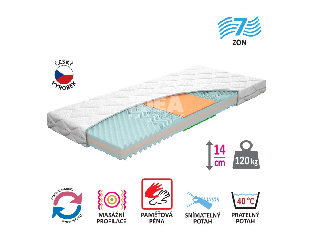 paměťová pěna různých tuhostí v pánevních zónách pro odlehčení kloubům a celému pohybovému aparátu7zónová anatomická masážní profilace přináší velmi jemnou masáž v průběhu spánku