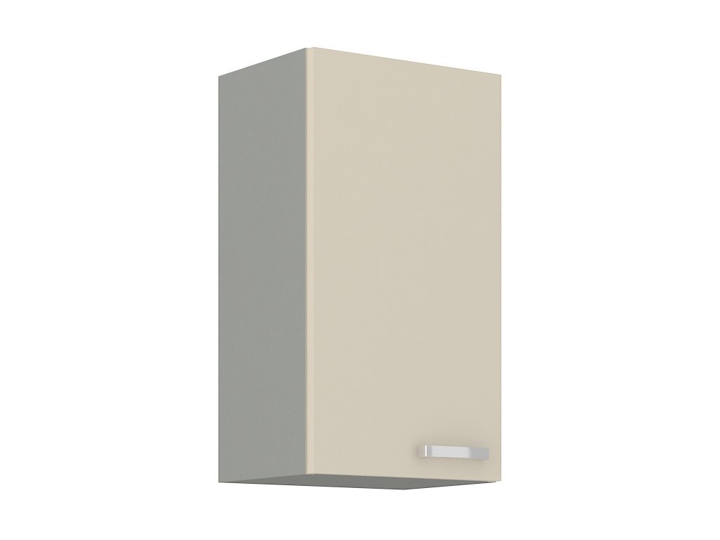 Horní skříňka jednodveřová KARMEN vyrobená z kvalitního lamina a MDF. Korpus je v barvě šedá a dvířka v barvě karmen krémová v lesku. Rozměry skříňky - šířka 40 cm, výška 71,5 cm, hloubka 31 cm. Úchyty jsou z kovu. Dvířka mají levé otvírání. V naší nabídce naleznete další výběr skříněk k sestavení celé kuchyně.Zusätzliche Parameter