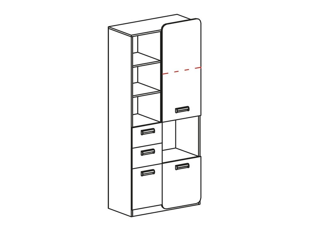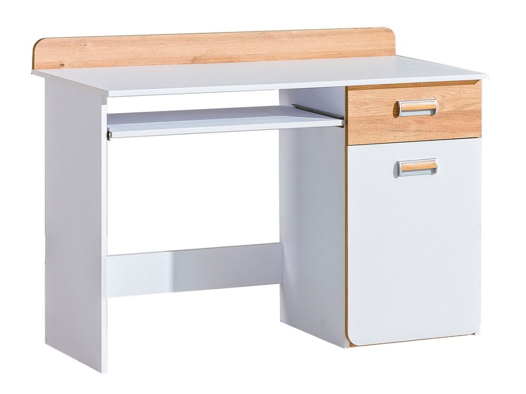 Sestava dětského pokoje Leo. Nábytek je vyrobený z kvalitní laminátové desky v barevném provedení bílá briliant, přední dvířka mají barevnou dekoraci - dub nash. . Sestava se skládá z těchto položek (Š x V x H) - kombinovaná skříň (80 x 188 x 40 cm), pracovní stůl (120 x 87 x 55 cm), závěsná police (110 x 65 x 22 cm), regál (35 x 154,5 x 38 cm) a šatní rohová skříň (71 x 188 x 71 cm). Úchyty jsou vyrobeny z plastu. Celá řada se vyznačuje zaoblenými tvary. Zásuvky mají kovový mechanismus výsuvu.