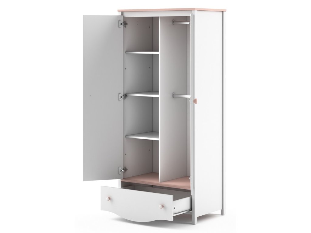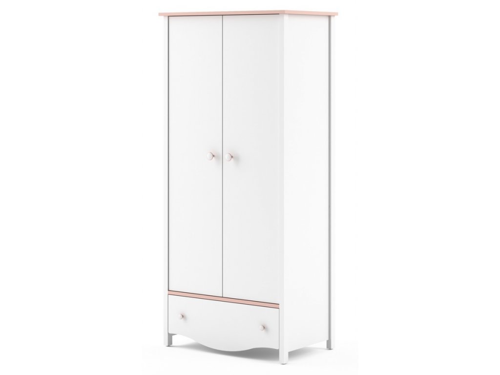 Skříň dvoudveřová MI-12 se zásuvkou ve spodní části. Uvnitř skříně jsou v pravé části dvě šatní tyče a v levé části 3 police. Nábytek je vyrobený z kvalitního lamina ohraničené ABS páskou, dolní část zásuvky je vyřezaná do obloučku. Skříň je v barvě bílé a růžové. V naší nabídce najdete mnoho dalších prvků stejné sestavy a tento široký výběr Vám zaručí sestavit si útulný dětský pokoj. Dodáváme v demontovaném stavu.Doplňkové parametry