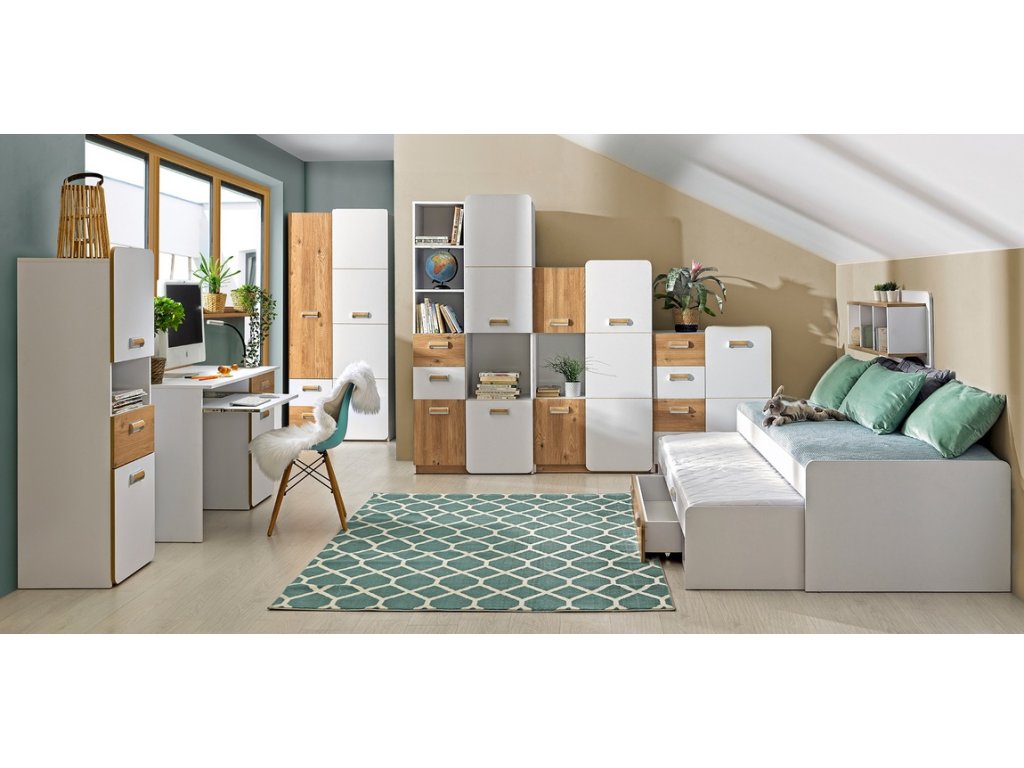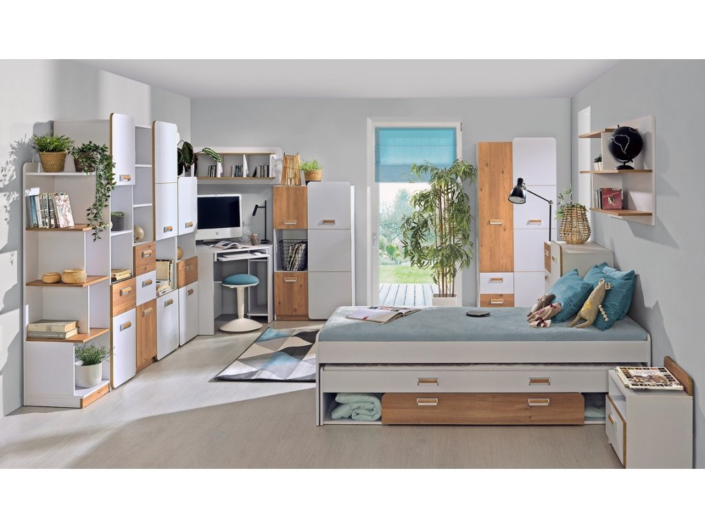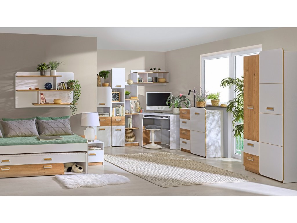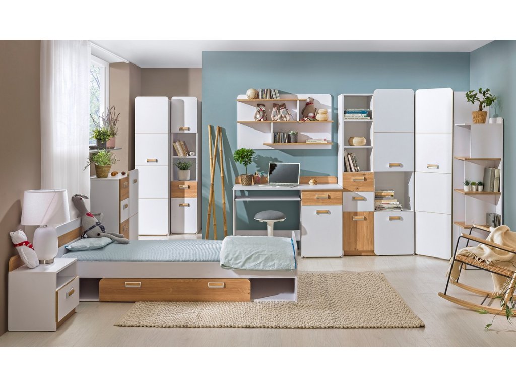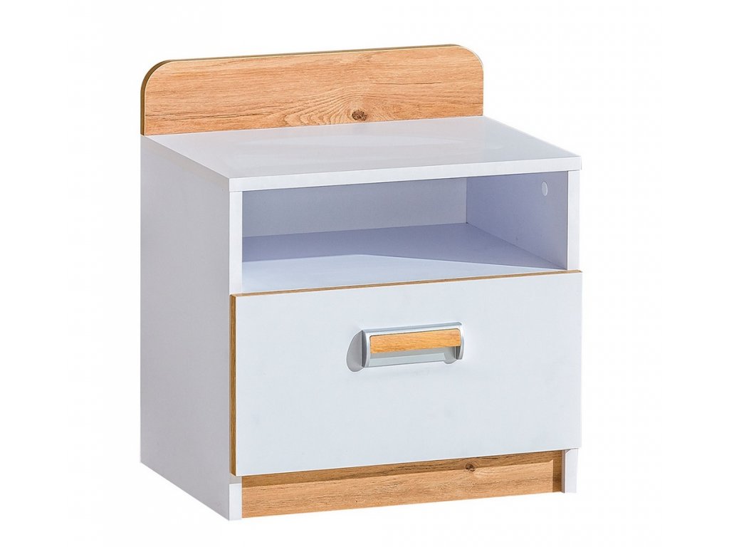 Noční stolek z kolekce Leo se zaoblenými tvary a plastovými úchyty ve bílém brilantním provedení s předními dvířky v dubovém nádechu. Je skvělým doplňkem do dětského, nebo studentského pokoje. Noční stolek s jedním šuplíkem je dostupný ve třech barevných variantách . Sestava Leo obsahuje 16 prvků, které umožňují individuální sestavení nábytku. Stačí se podívat na fotografie pokojů a můžete se inspirovat!