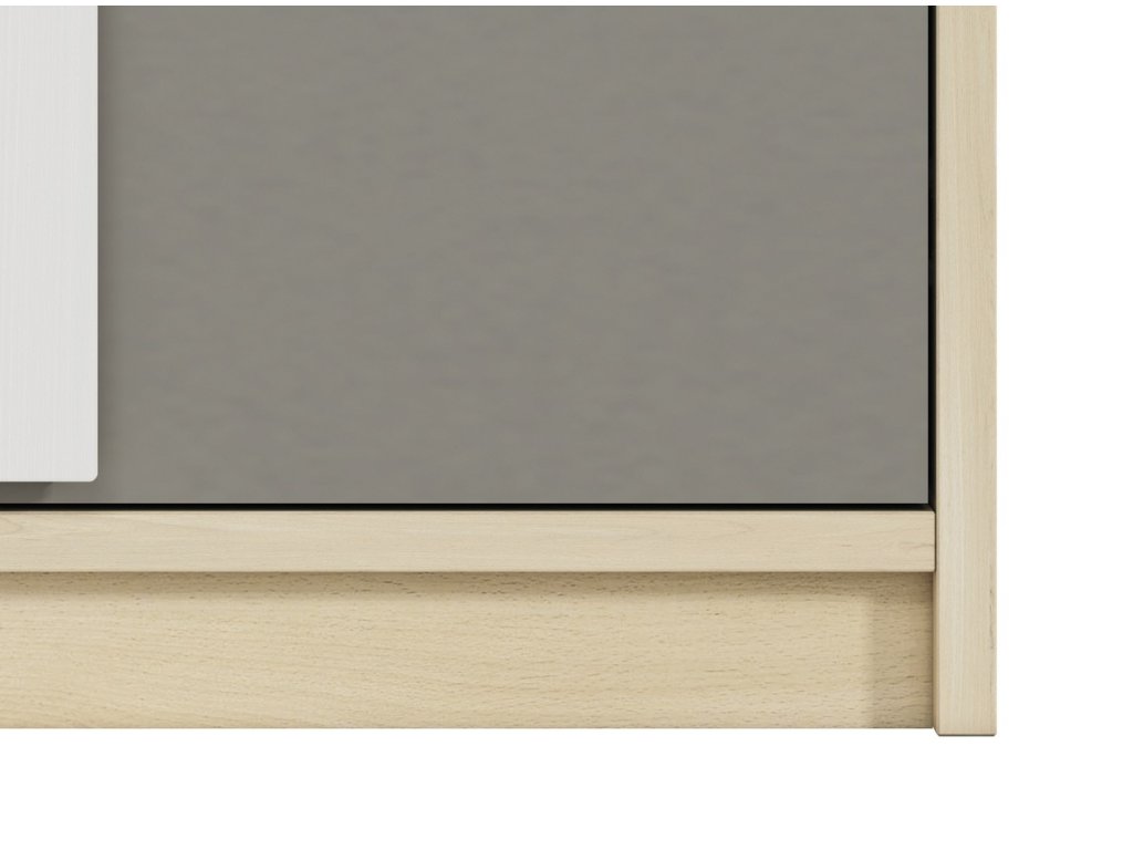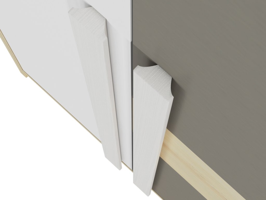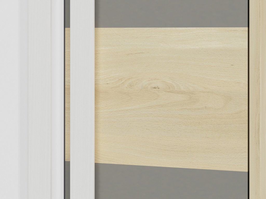 Šatní skříň dvoudveřová v moderním provedení. Korpus je vyroben z kvalitní desky LTD hraněné ABS páskou v barvě buk fjord, dvířka jsou vyrobeny z desky LTD v kombinaci barev buk fjord/bílá/šedá. V levé části skříně jsou dvě šatní tyče nad sebou, pravá část je vybavena policemi. Úchyty jsou dřevěné bílé. Dodáváme v demontovaném stavu.Doplňkové parametry