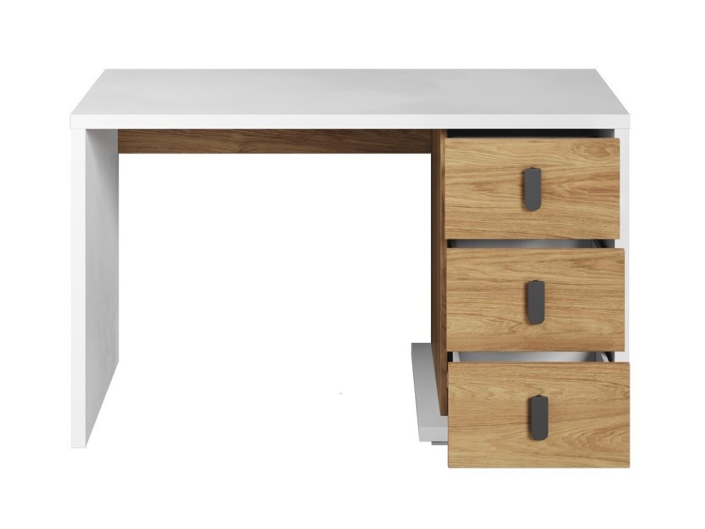 Pracovní stůl se třemi zásuvkami v jemném přírodním stylu. Korpus je vyroben z desky LTD v barvě bílá, zásuvky jsou vyrobeny z desky LTD v barvě ořech natural. Dodáváme v demontovaném stavu.Doplňkové parametry