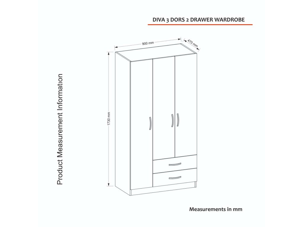 - Vybavení: 1 šatní tyč, 2 zásuvky a 3 police