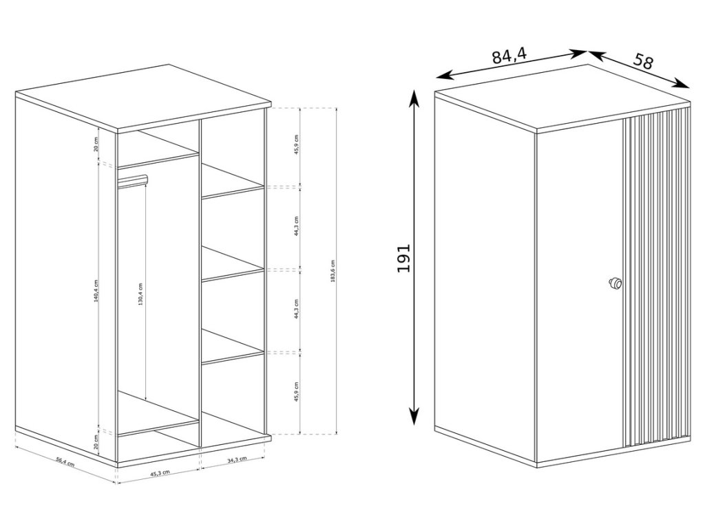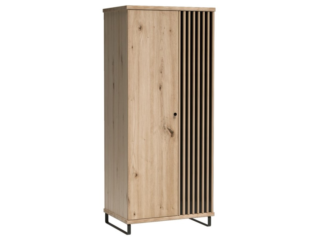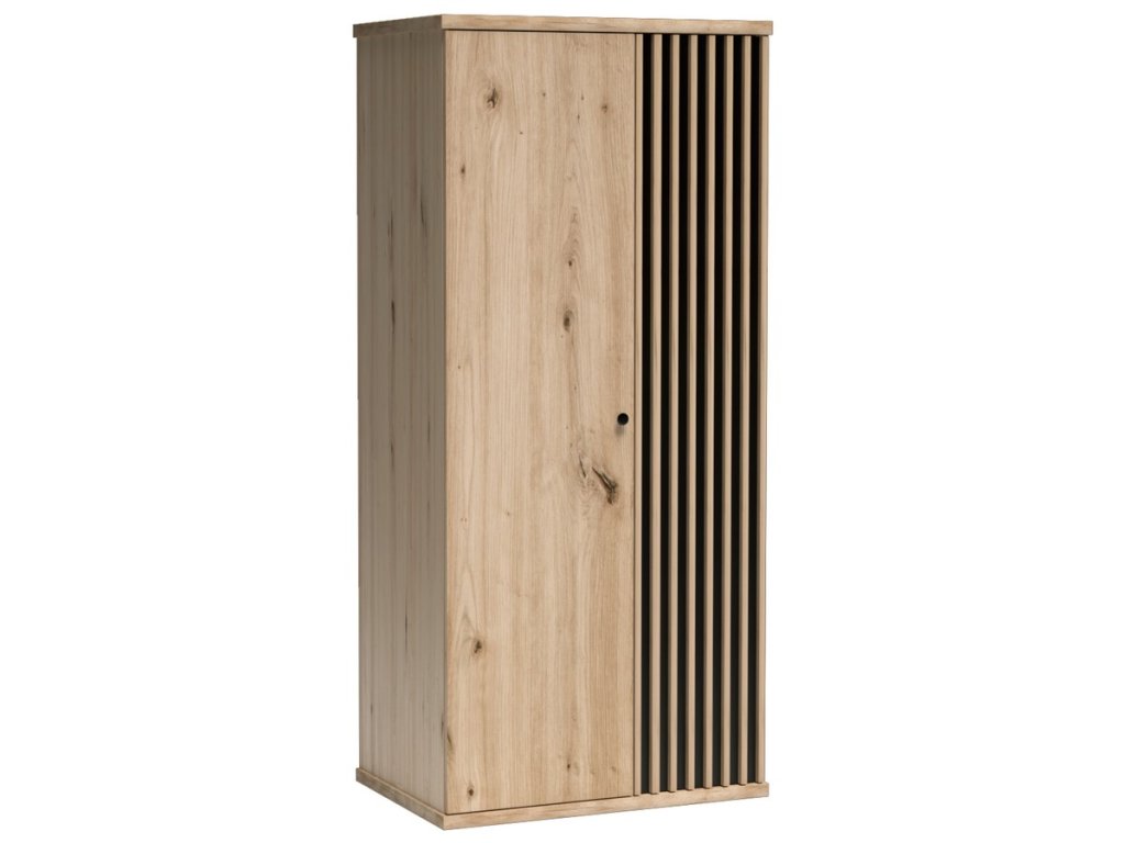 Šatní skříň dvoudveřová s netradičním provedením detailu dvířek s lamelami. Kolekce nábytku v sobě spojuje jednoduchost, originální vzhled a funkčnost. Barevné provedení je v kombinaci dub artisan/černá mat. Nábytek je vyroben z kvalitního lamina ohraničeného ABS páskou, dekorační lamely jsou vyrobeny z desky MDF. Uvnitř skříně je v levé části police a šatní tyč, v pravé části jsou police. Kolekce se skládá z mnoha prvků a tento široký výběr Vám zaručí sestavit si nábytek podle svých vlastních představ a přání. Dodáváme v demontovaném stavu.Doplňkové parametry