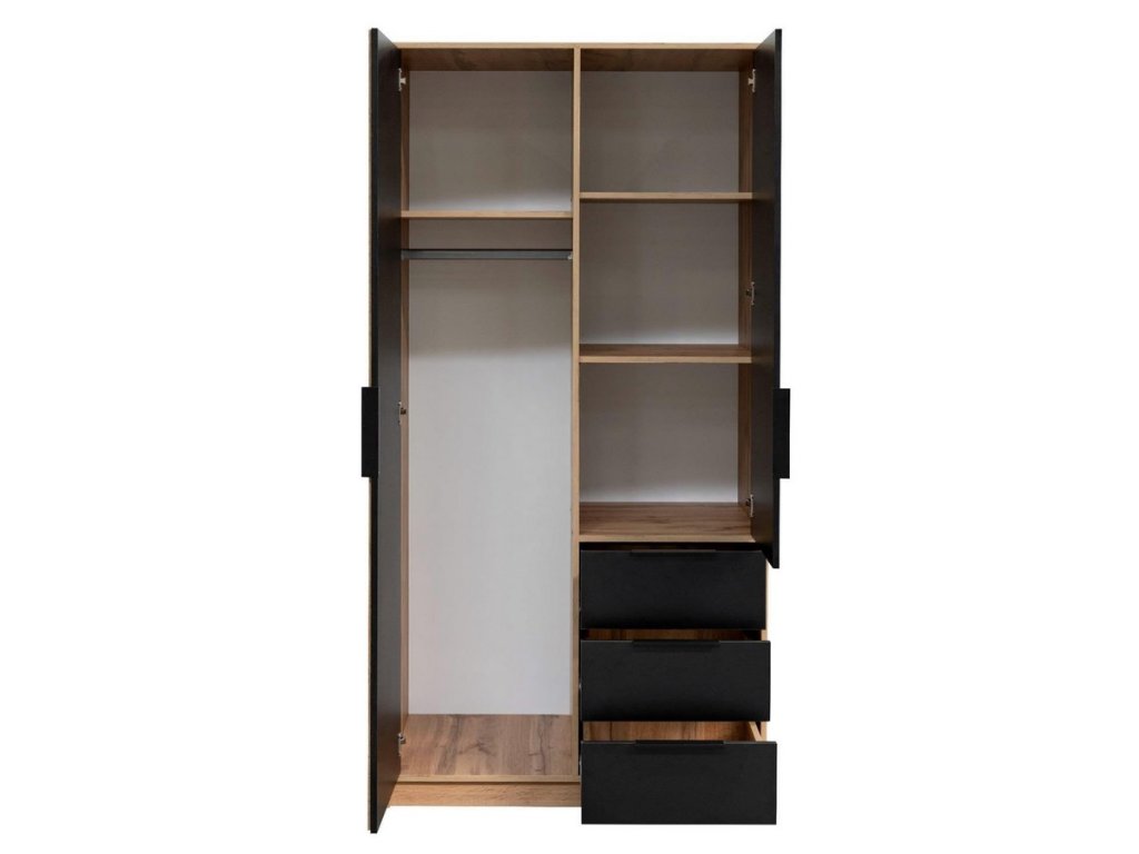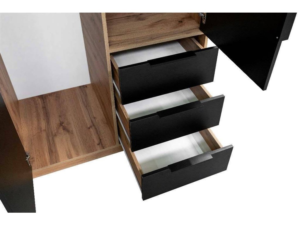 Šatní skříň dvoudveřová se třemi zásuvkami v moderním provedení. Korpus i dvířka jsou z kvalitní LTD desky s MDF dekoračními lištami v kombinaci barev dub wotan/černá doplněné zrcadlem. Uspořádání polic viz. obrázek. Dodáváme v demontovaném stavu.Doplňkové parametry