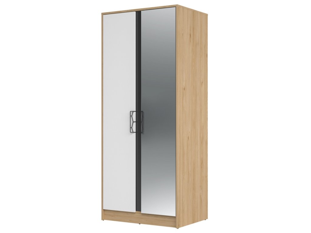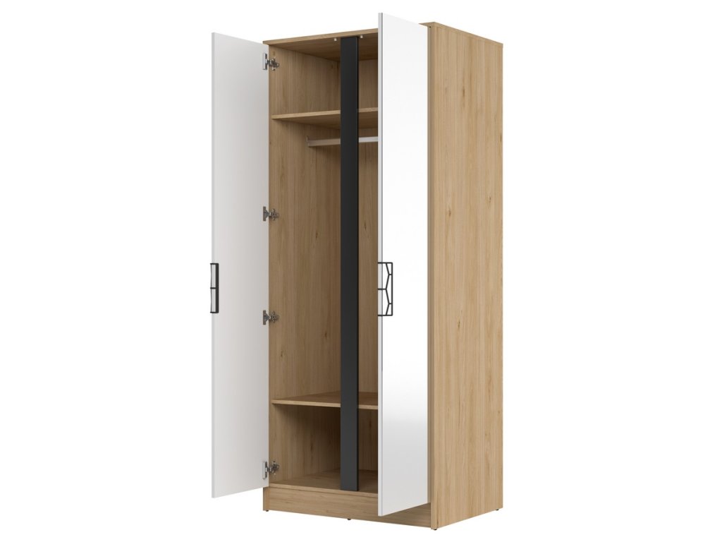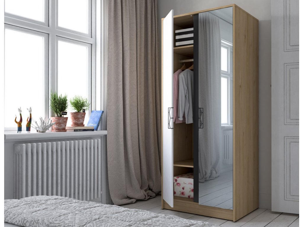 Šatní skříň dvoudveřová se zrcadlem v moderním provedení. Korpus je vyroben z kvalitní desky LTD v barvě ořech americký jackson, dvířka jsou vyrobeny z desky MDF v barvě bílá mat, jedna polovina dveří má z vnější strany zrcadlo. Přední část skříně doplňuje deska MDF v barvě grafit mat. Uvnitř skříně je šatní tyč a dvě police. Úchyty jsou kovové v barvě grafit mat. Dodáváme v demontovaném stavu.Doplňkové parametry