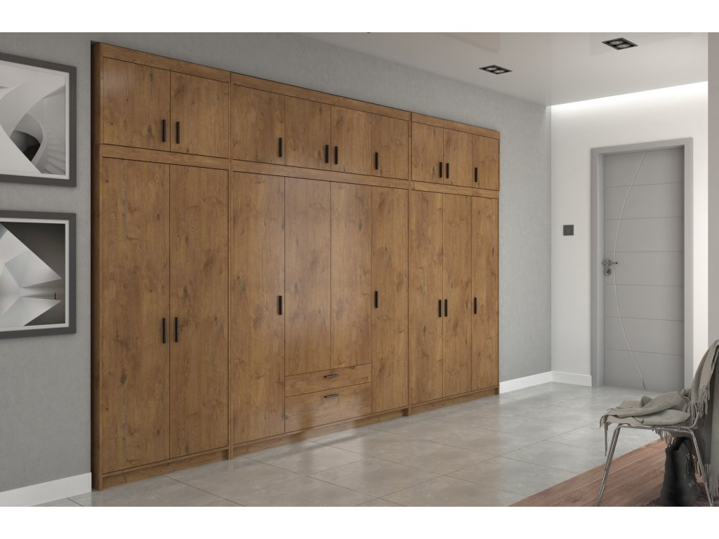Šatní skříň ve stylovém, ale velmi praktickém provedení. Nábytek je vyrobený z lamina v barvě dub lefkas. Lamino je odolné proti poškrábání, poškození, vlhkosti a vysokým teplotám. Vnitřní prostor vyobrazen na perokresbě. Možnost dokoupení nádstavce nad skříň. Dodáváme v demontovaném stavu.Doplňkové parametry