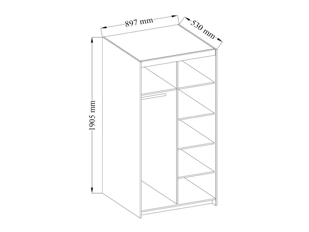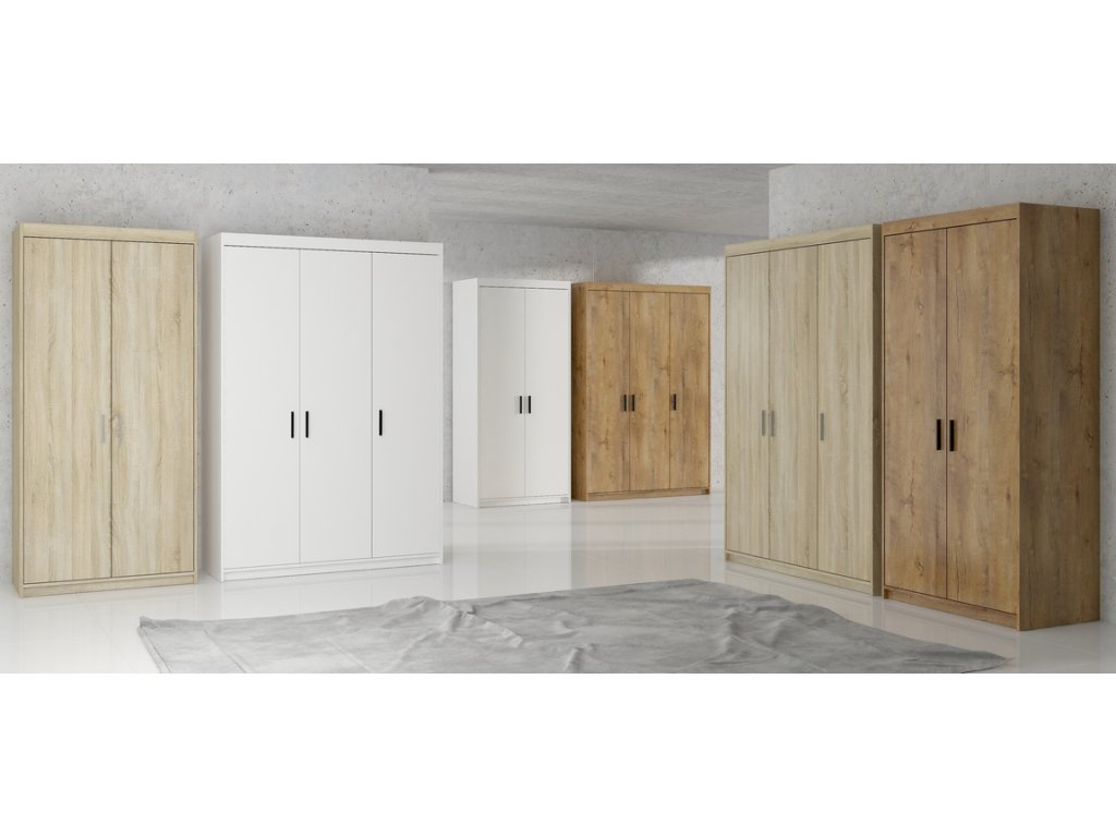 Šatní skříň ve stylovém, ale velmi praktickém provedení. Nábytek je vyrobený z lamina v barvě dub sonoma. Lamino je odolné proti poškrábání, poškození, vlhkosti a vysokým teplotám. Vnitřní prostor vyobrazen na perokresbě. Možnost dokoupení nádstavce nad skříň. Dodáváme v demontovaném stavu.Doplňkové parametry