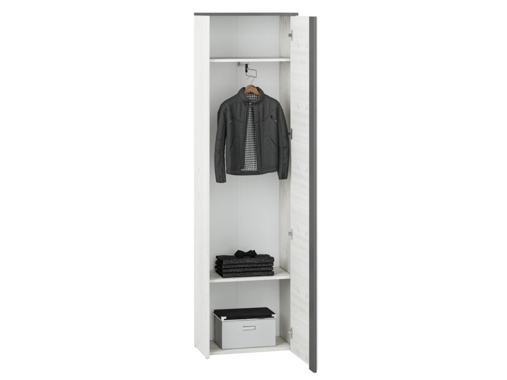 Šatní skříň je vyrobena z desky LTD v kombinaci barev borovice sněžná/antracit. Dvířka je možné namontovat na pravou nebo levou stranu. Dodáváme v demontovaném stavu.Doplňkové parametry