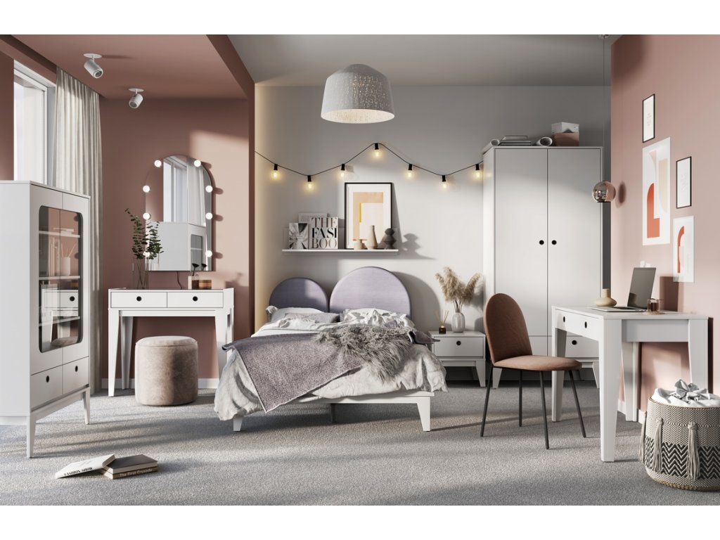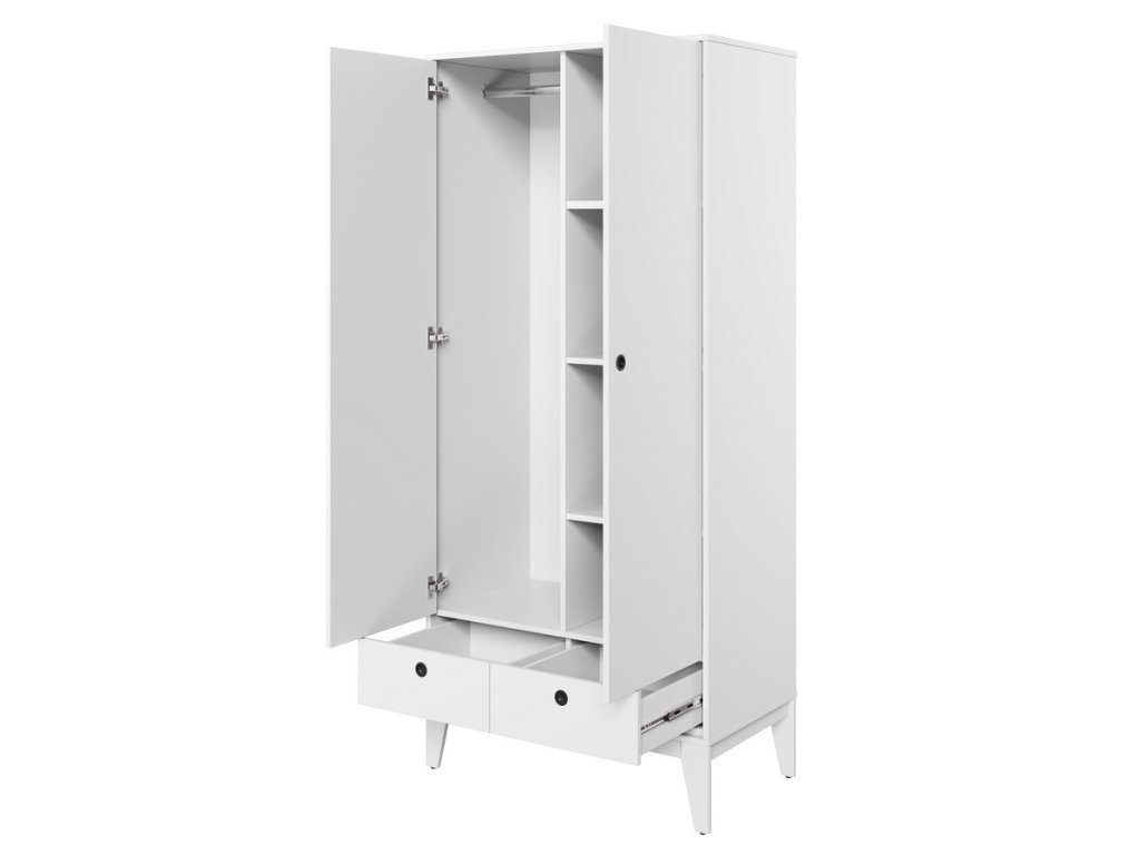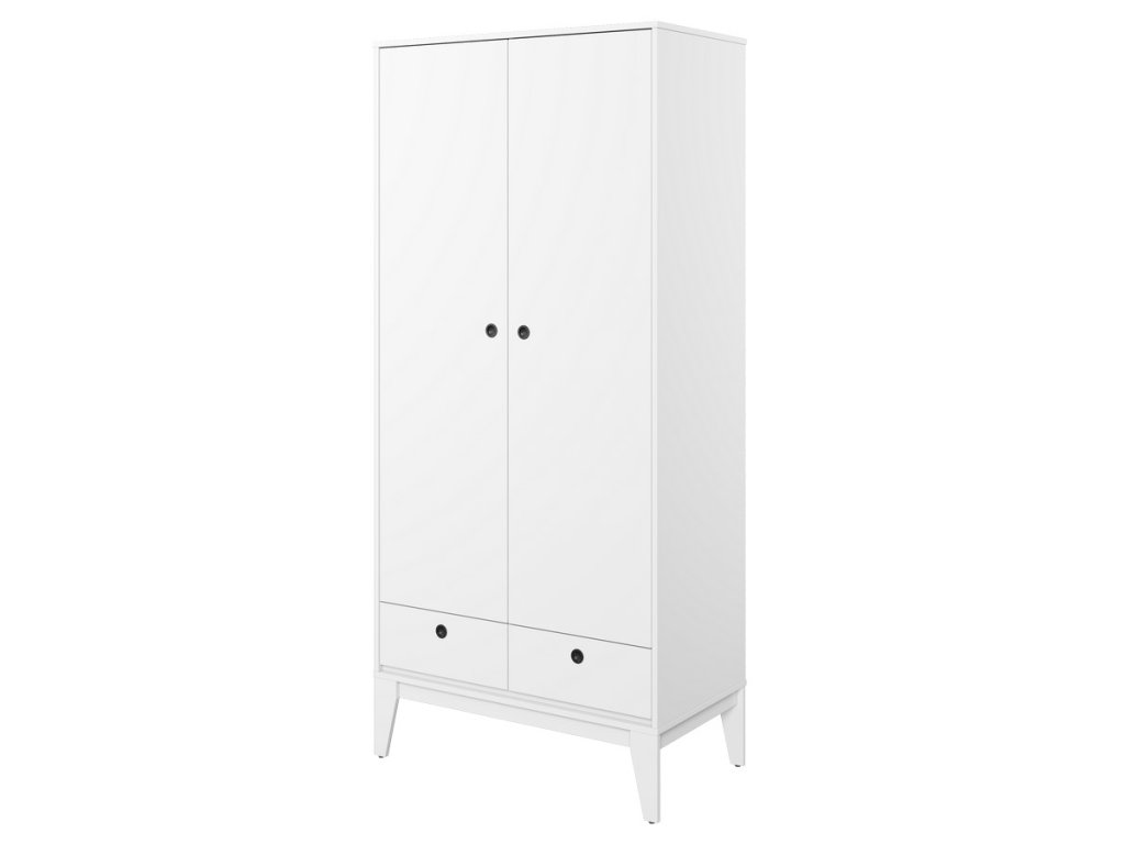 Šatní skříň dvoudveřová se dvěma zásuvkami v moderním provedení. Nábytek je vyroben z desky LTD hraněné páskou ABS v barvě bílá mat. Uvnitř skříně jsou v pravé části police a v levé části je šatní tyč. Dodáváme v demontovaném stavu.Doplňkové parametry