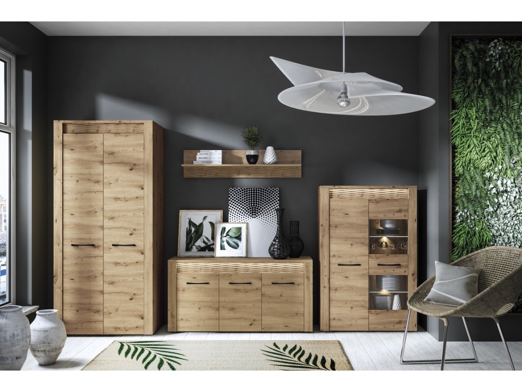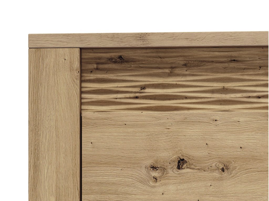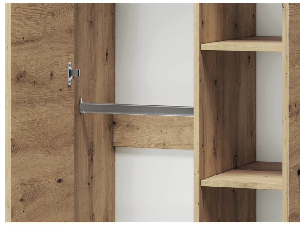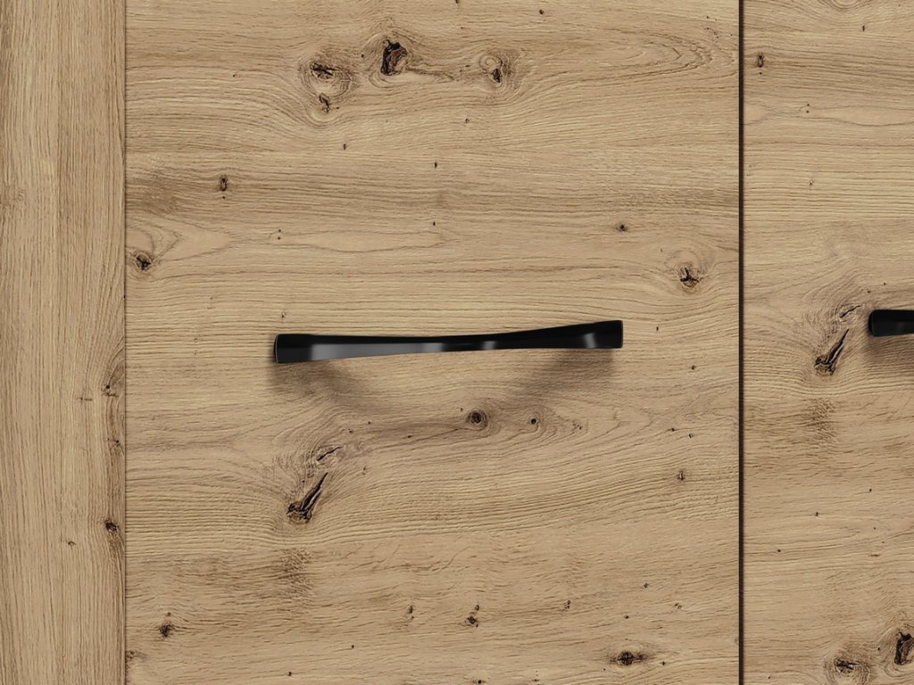 Šatní skříň dvoudveřová je vyrobena z kvalitní desky LTD hraněné ABS páskou v barvě dub artisan. Dvířka jsou vybaveny systémem tichého dovírání. Dekorační riflovaná lišta nahoře je z MDF. Úchyty jsou kovové černé. Dodáváme v demontovaném stavu.Doplňkové parametry