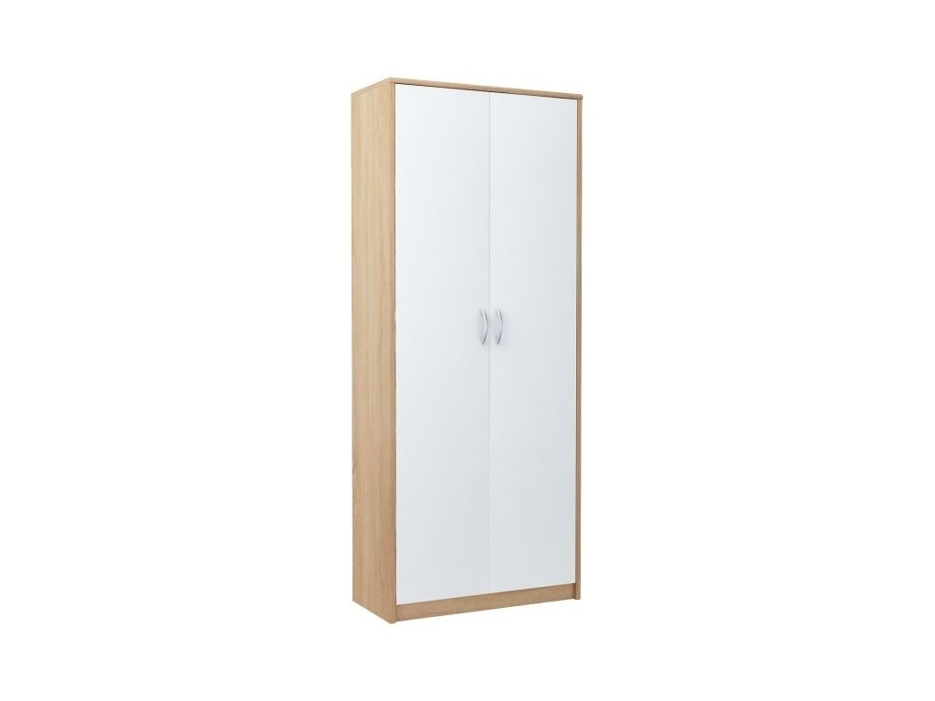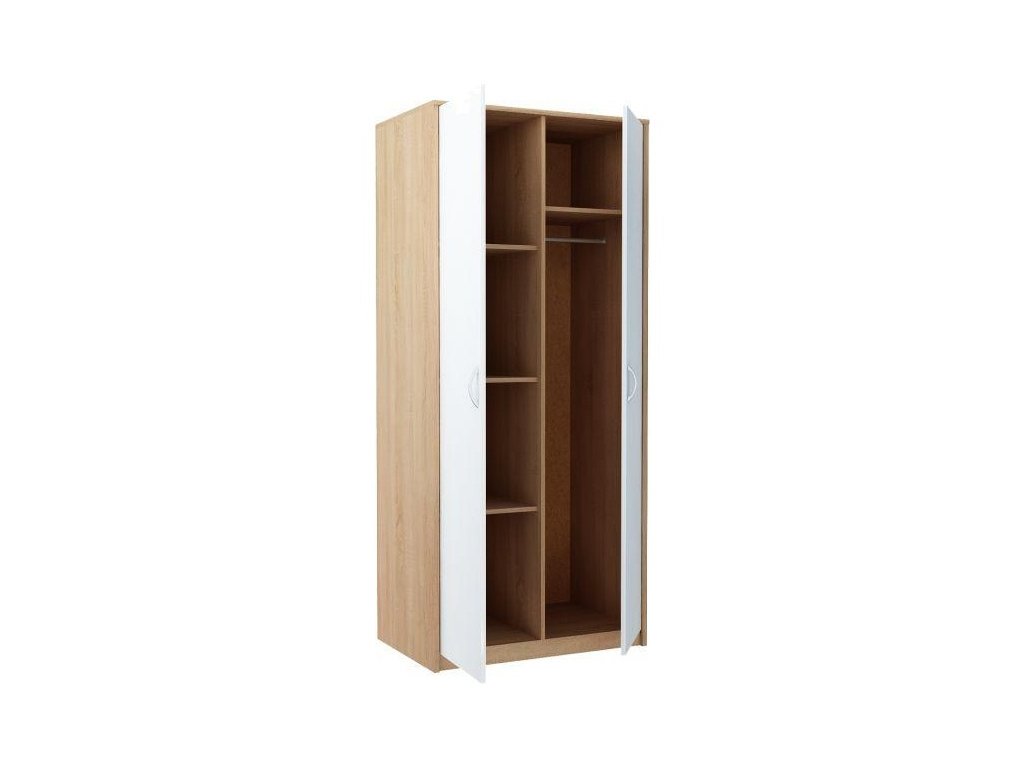 Šatní skříň v jednoduchém, ale velmi praktickém provedení a moderním designu. Korpus i dvířka jsou z kvalitní LTD. Korpus je v barvě dub sonoma, dvířka v barvě matné bílé. Lamino je odolné vůči vysokým teplotám, poškrábání a nárazům, hraněné ABS páskou. Jasně viditelná struktura dřeva. Dodáváme v demontovaném stavu.Doplňkové parametry