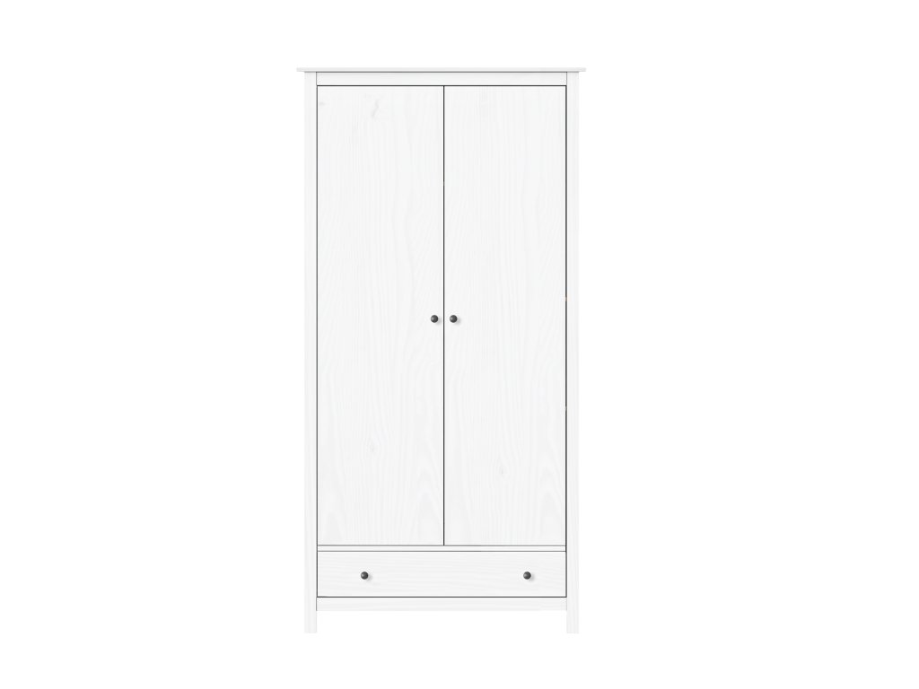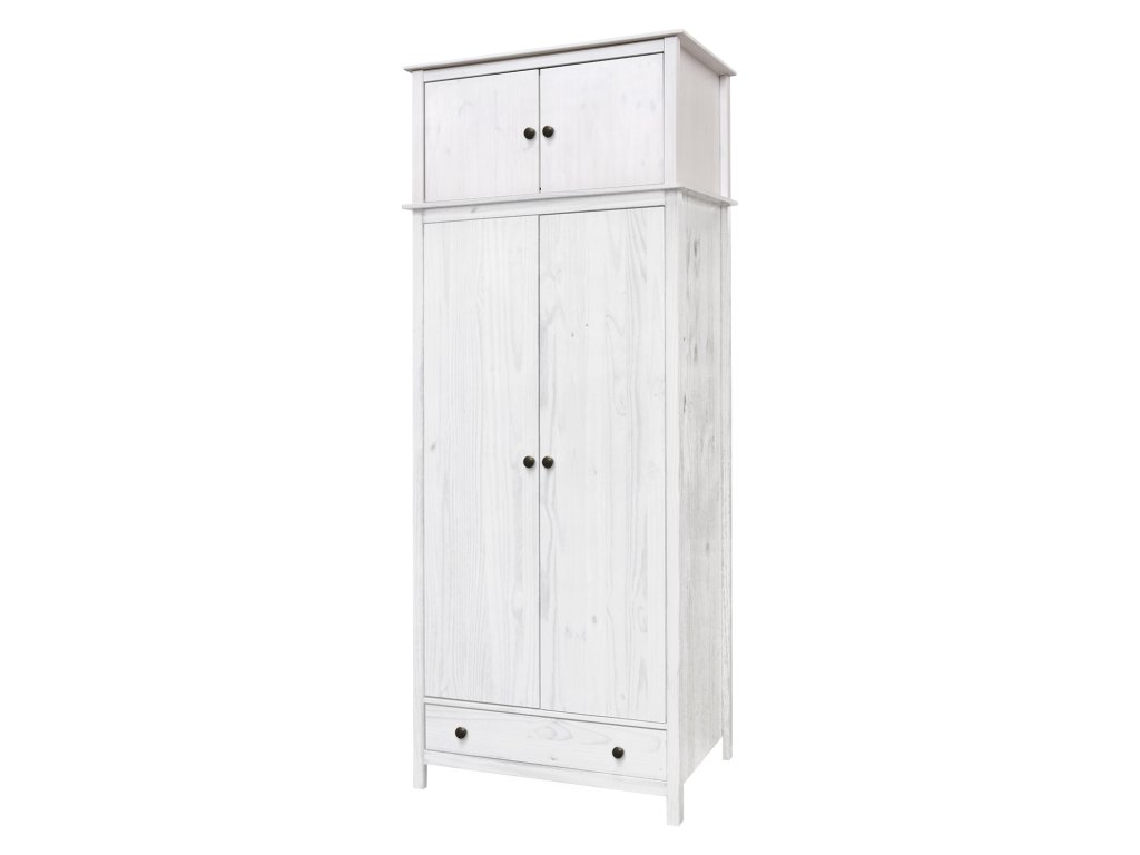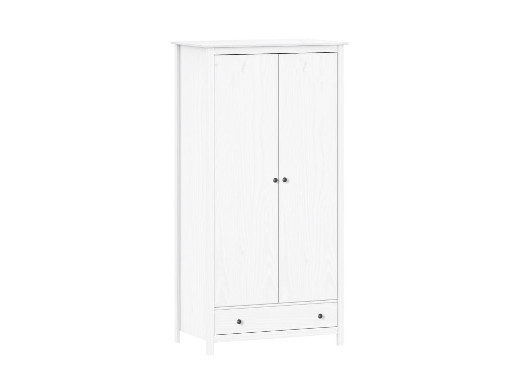 materiál masiv borovice, barevné provedení bílý lak kovové úchytky v barevném provedení černěná mosaz šatní skříň vybavená šatní tyčí a policí ve spodní části zásuvka s kovovými pojezdy vnitřek skříně v provedení čirý nebo bílý lak doporučený nástavec 8188BKDoplňkové parametry
