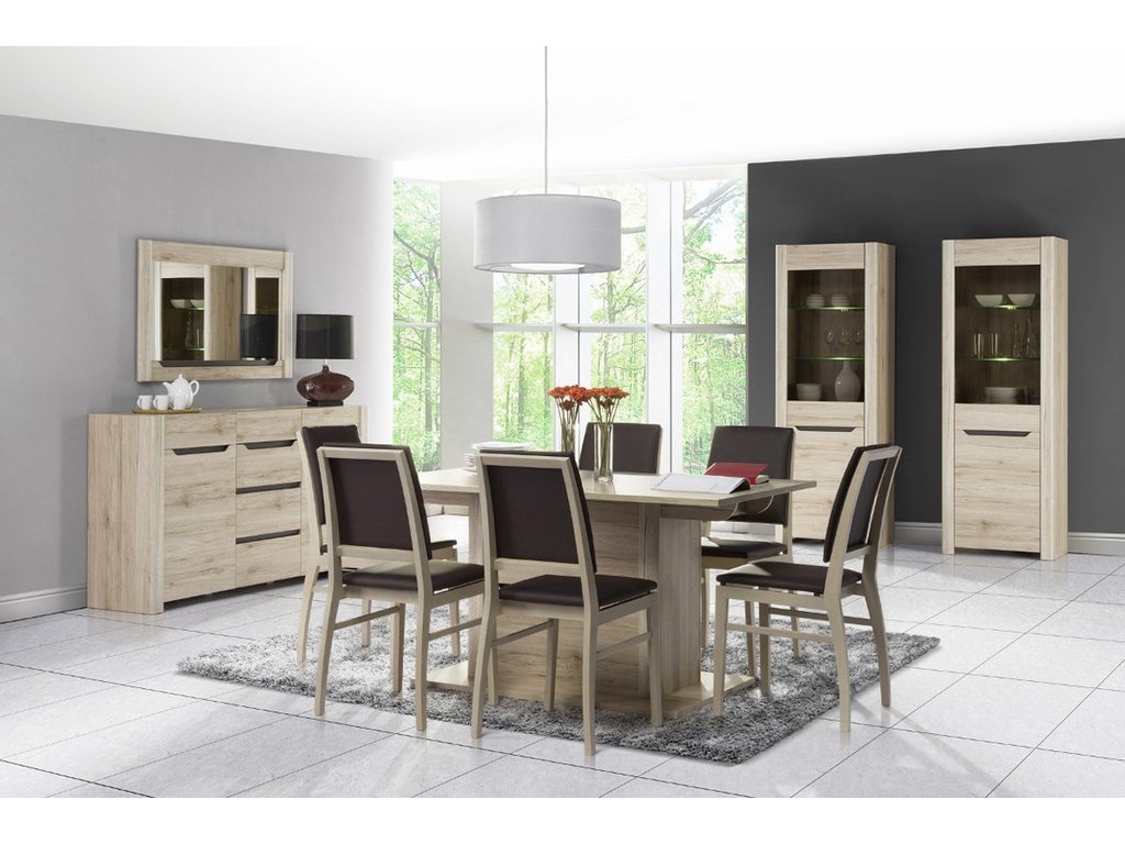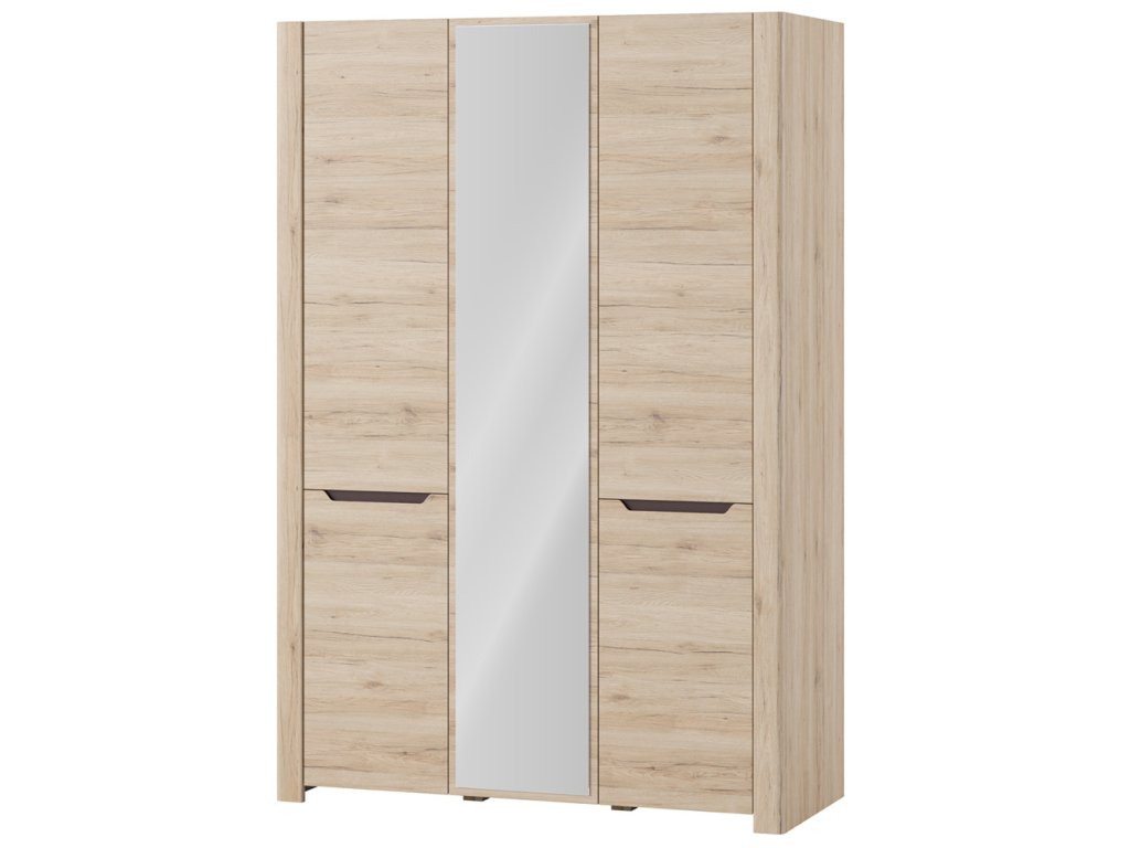 Šatní skříň třídveřová ze sektorové řady DESJO. Skříň nabízí 2 možnosti namontování postranních polic a šatní tyče - viz perokresba. Tento moderní nábytek je součástí sestavy určené do jídelny nebo obývacího pokoje. Celá řada se vyznačuje úspěšnou kombinací současné a moderní přírodní formy. Jednoduchý styl umocňuje senzační bezúchytový systém nábytku. Vyrábí se z vysoce kvalitní dýhované dřevotřískové desky s fólií. Dekor s 3D efektem vizuálně dává dojem hlubokého povrchu. Široký výběr vám zaručí si sestavit nábytek podle svých představ. Barevné provedení je dub sanremo s dekorativním proužkem hnědé barvy. Nábytek se dodává v demontovaném stavu. Výrobce doporučuje vysoký nábytek připevnit ke stěně. Možnost dokoupení vnitřního LED osvětlení.Doplňkové parametry