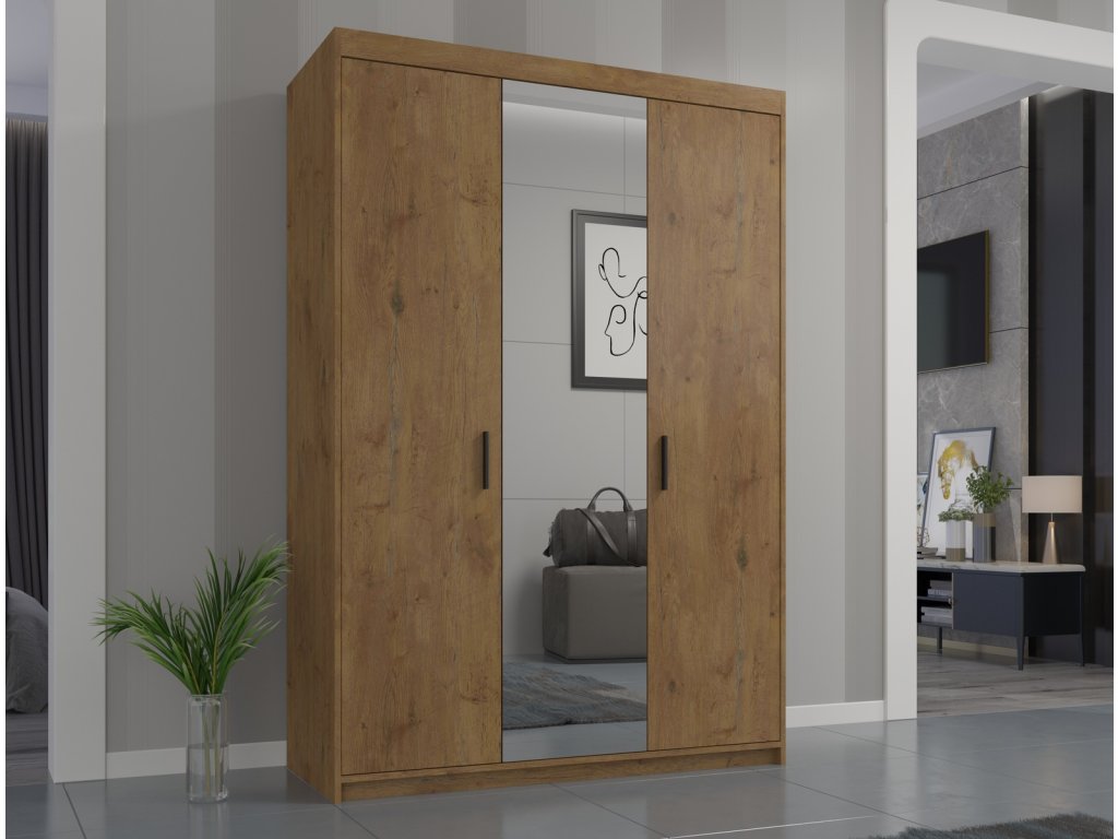 Šatní skříň ve stylovém, ale velmi praktickém provedení. Nábytek je vyrobený z lamina v barvě dub lefkas se zrcadlem. Lamino je odolné proti poškrábání, poškození, vlhkosti a vysokým teplotám. Vnitřní prostor vyobrazen na perokresbě. Možnost dokoupení nádstavce nad skříň. Dodáváme v demontovaném stavu.Doplňkové parametry