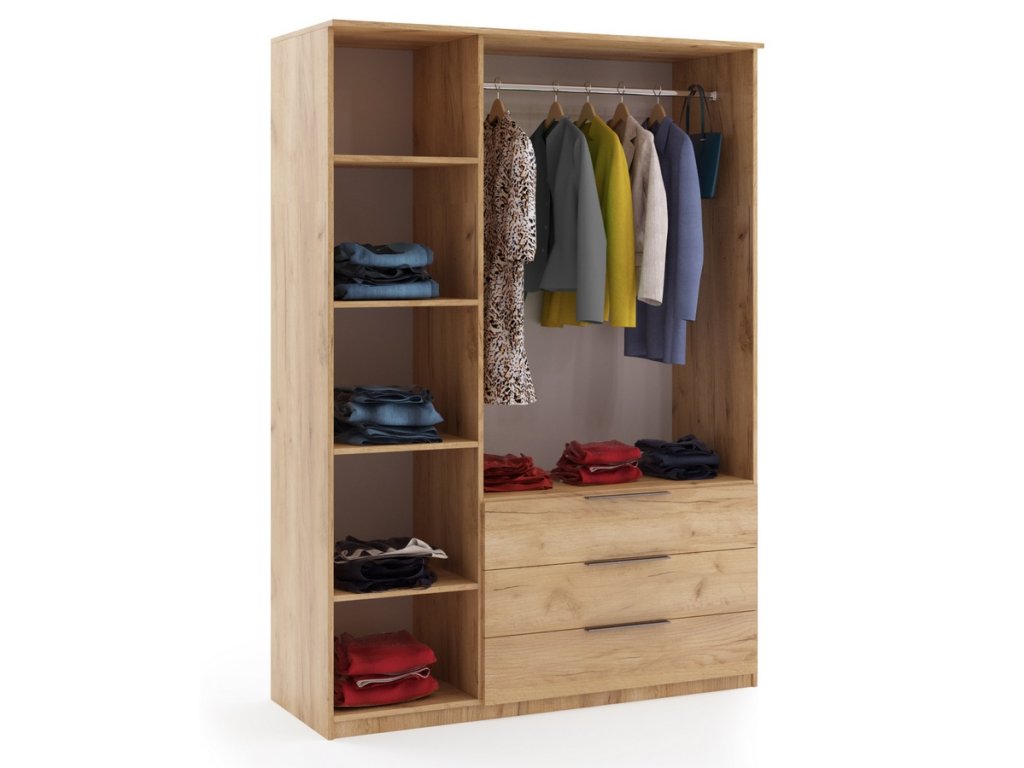 Šatní skříň třídveřová se třemi zásuvkami v moderním provedení. Korpus i dvířka jsou z kvalitní LTD desky v kombinaci barev dub kraft zlatý/černá doplněné zrcadlem. Uspořádání polic viz. obrázek. Úchyty jsou kovové. Dodáváme v demontovaném stavu.Doplňkové parametry