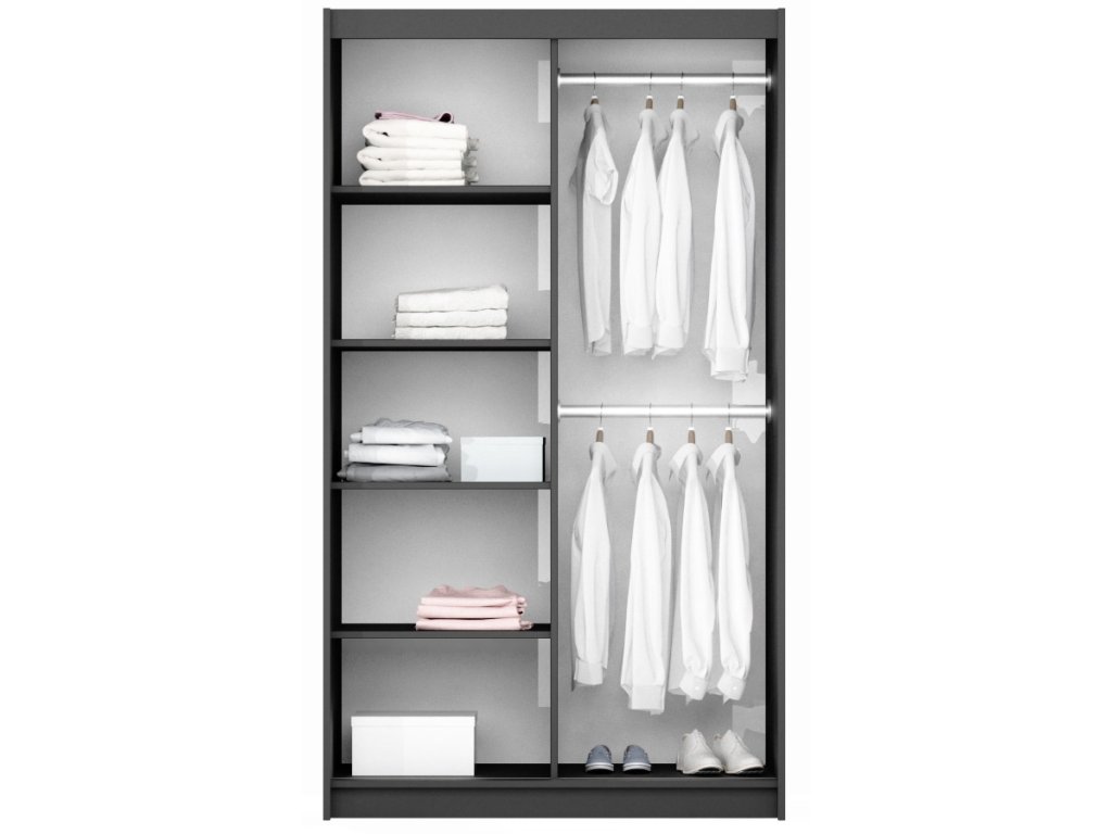 Šatní skříň s posuvnými dveřmi v moderním provedení vhodná do monochromatického interiéru. Korpus i dvířka jsou z kvalitní LTD desky bílé barvy. Dveře jsou v barvě bílé doplněné zrcadlem. Uspořádání polic viz. obrázek. Dodáváme v demontovaném stavu.Doplňkové parametry