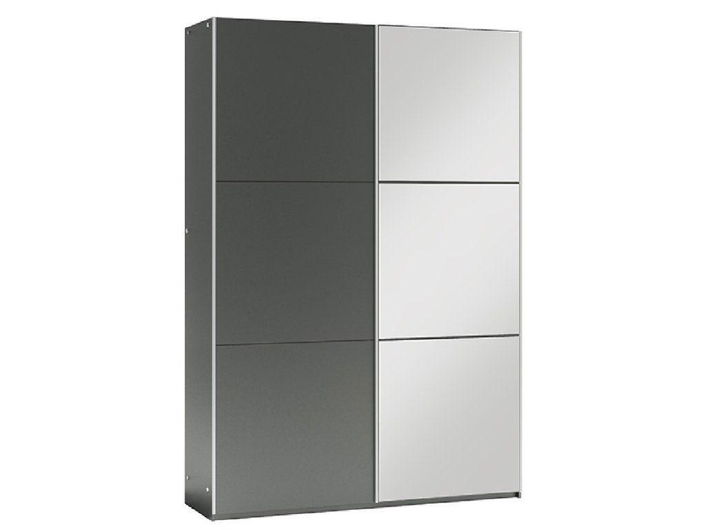 Šatní skříň s posuvnými dveřmi v moderním provedení vhodná do monochromatického interiéru. Korpus i dvířka jsou z kvalitní LTD desky grafitové barvy. Dveře jsou v barvě grafitové doplněné zrcadlem. Uspořádání polic viz. obrázek. Dodáváme v demontovaném stavu.Doplňkové parametry