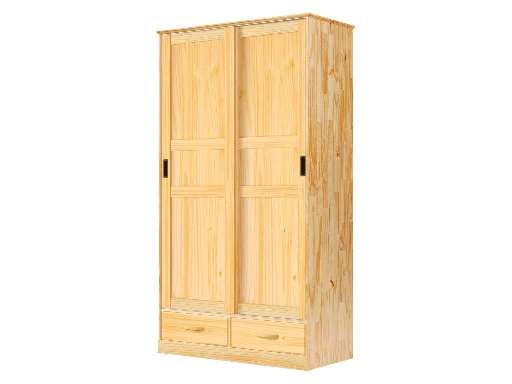 materiál masiv borovice, lakované provedení 2 zásuvky s kovovými pojezdy, 2 posuvné dveře v levé části 4 police, v pravé části 1 police a kovová šatní tyčDoplňkové parametry