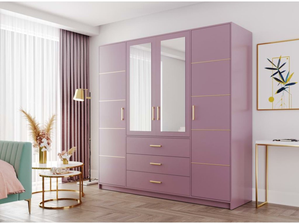 Šatní skříň 4-dveřová v moderním provedení. Korpus i dvířka jsou z kvalitního LTD v barvě pastelově fialová. Skříň obsahuje praktické zrcadlo. Dveře skříně jsou dekorovány tenkými černými lamelami. Uspořádání polic viz. perokresba. Dodáváme v demontovaném stavu.Doplňkové parametry