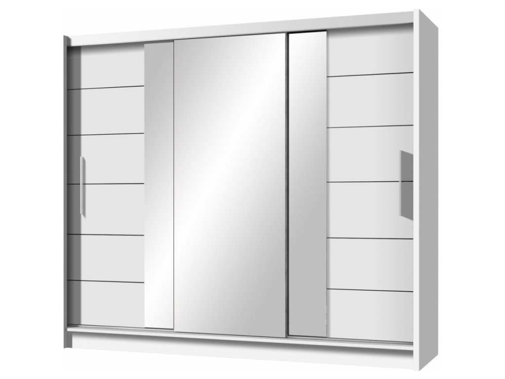 Šatní skříň s třemi posuvnými dveřmi v moderním provedení. Krajní části jsou policové, uprostřed je šatní tyč a 2 zásuvky. Korpus a dveře jsou z kvalitního LTD v bílé barvě. Uprostřed je zrcadlo. Uspořádání polic viz. perokresba. Pojezdové lišty jsou hliníkové. Dodáváme v demontovaném stavu.Doplňkové parametry