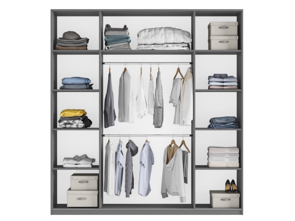 Šatní skříň s posuvnými dveřmi v jednoduchém moderním provedení. Korpus i dvířka jsou z kvalitní LTD desky v barvě bílá mat. Dveře jsou dekorovány zrcadlem. Otevírání dveří zajišťuje posuvné kování značky Häfele. Uspořádání polic viz. perokresba. Dodáváme v demontovaném stavu.Doplňkové parametry